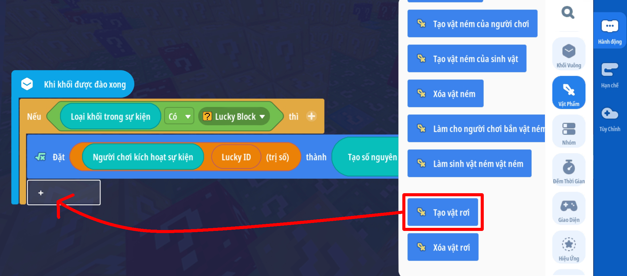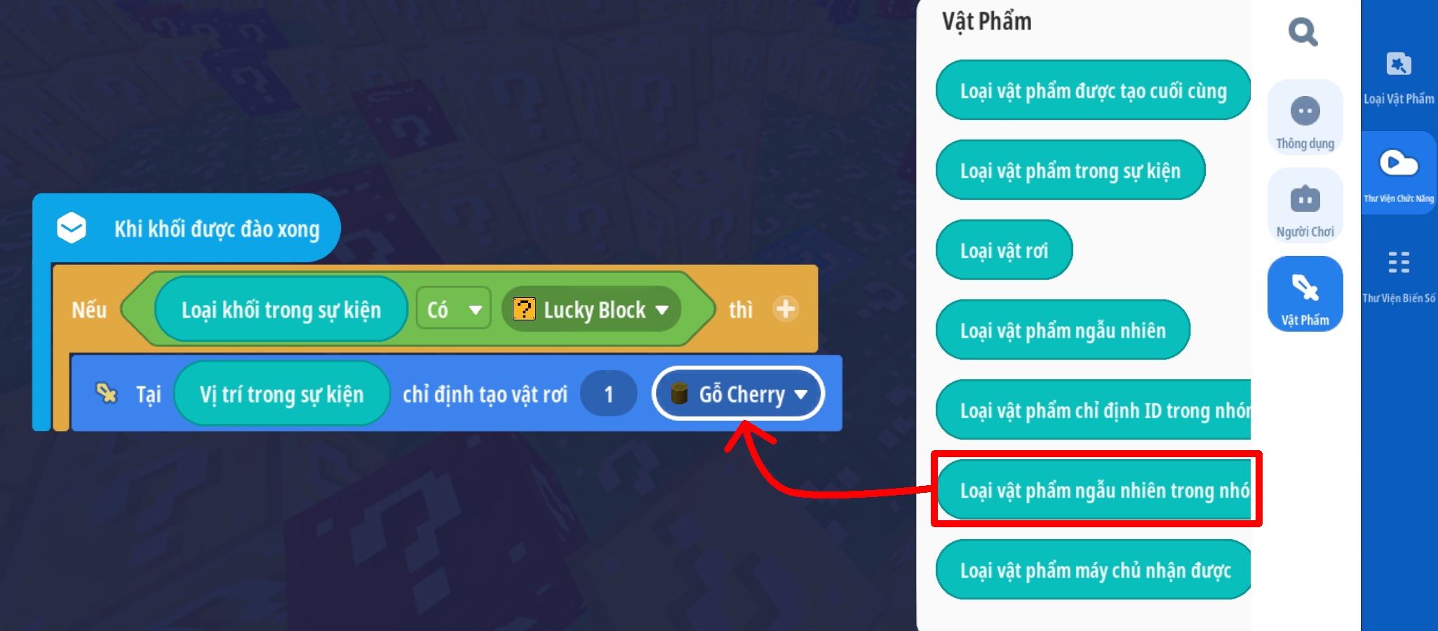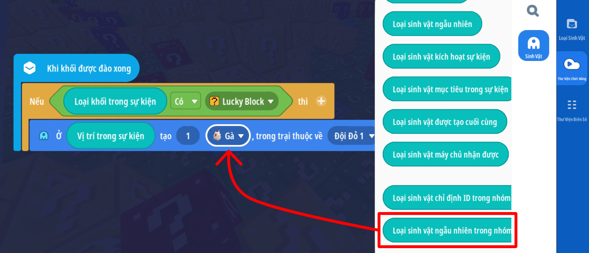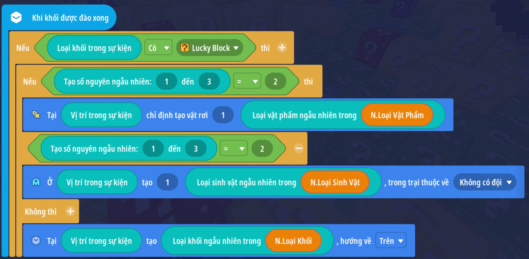 Mô tả chức năng: Khi người chơi tác động sự kiện với khối vuông sẽ rơi ra vật phẩm, tạo sinh vật hoặc tạo khối với xác suất như nhau
