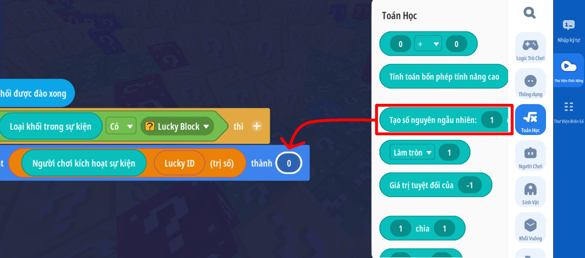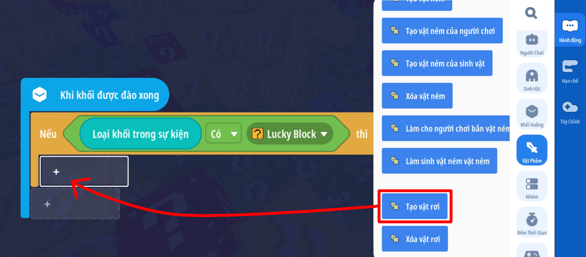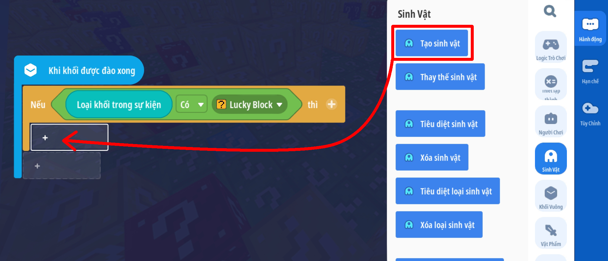 Mô tả chức năng: Khi người chơi tác động sự kiện với khối vuông sẽ rơi ra vật phẩm, tạo sinh vật hoặc tạo khối với xác suất như nhau