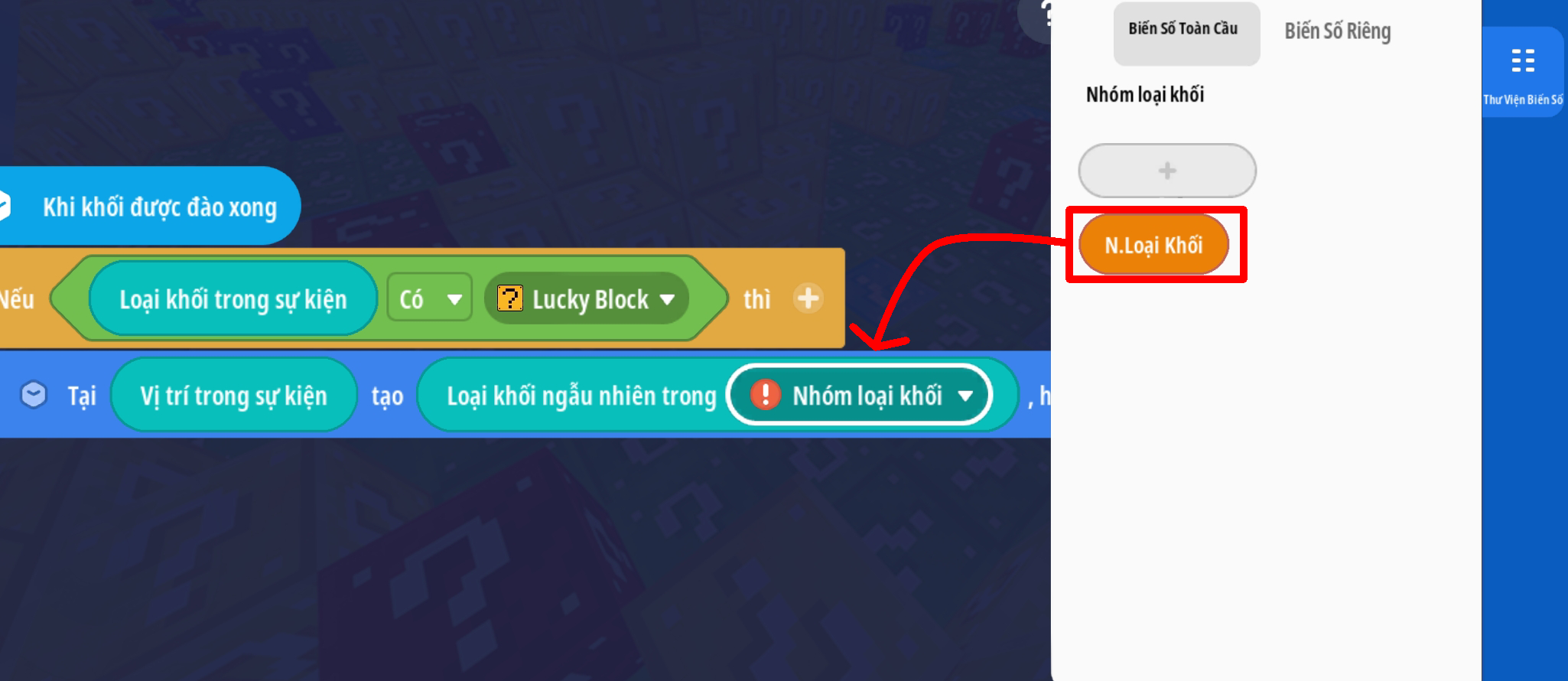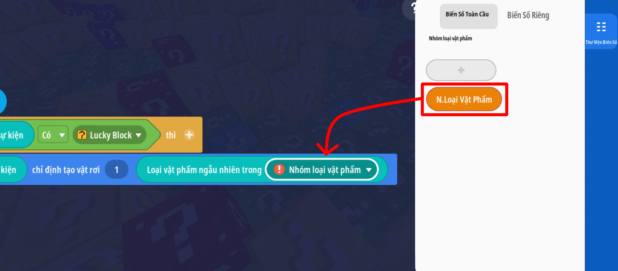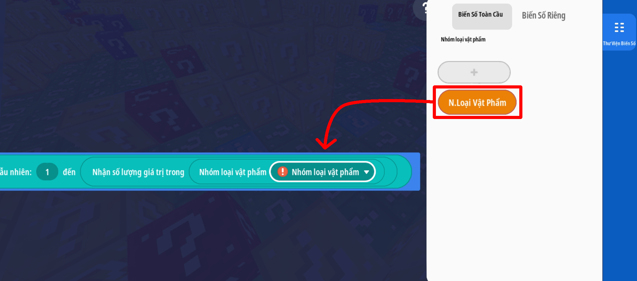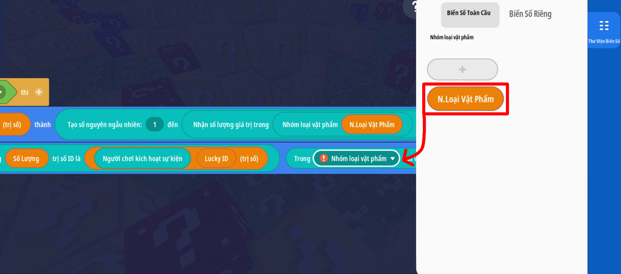 - Bước 1: Tạo biến nhóm loại khối. Thêm các khối sử dụng làm phần thưởng