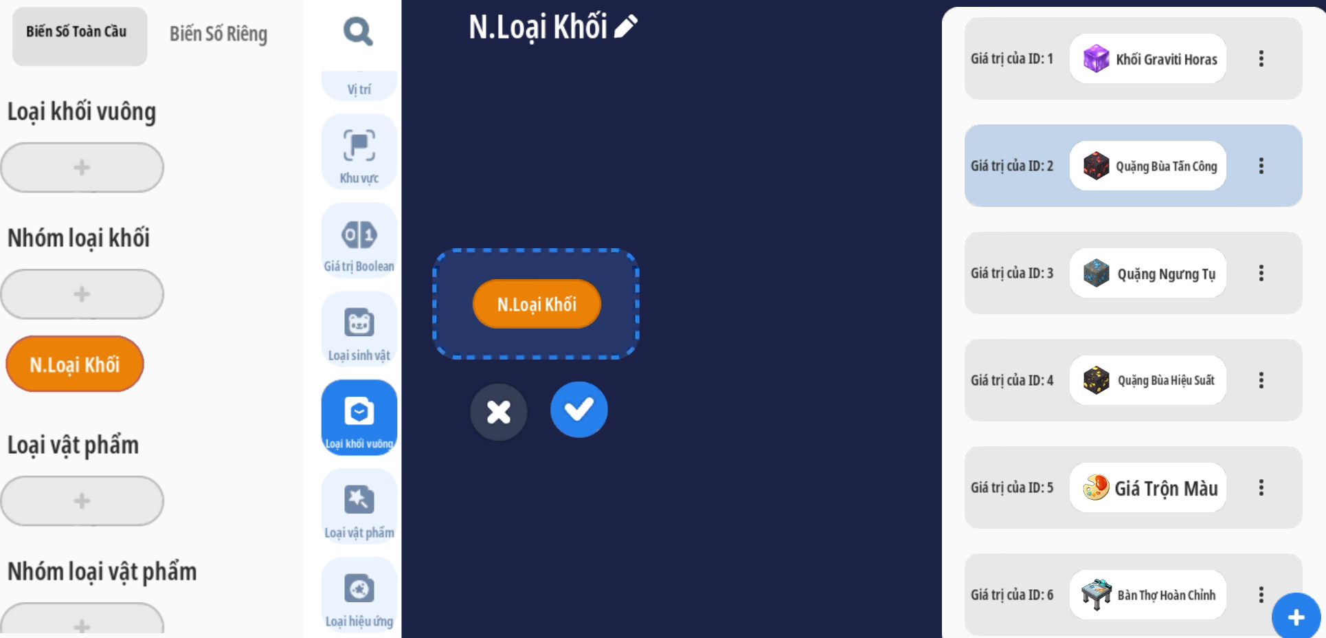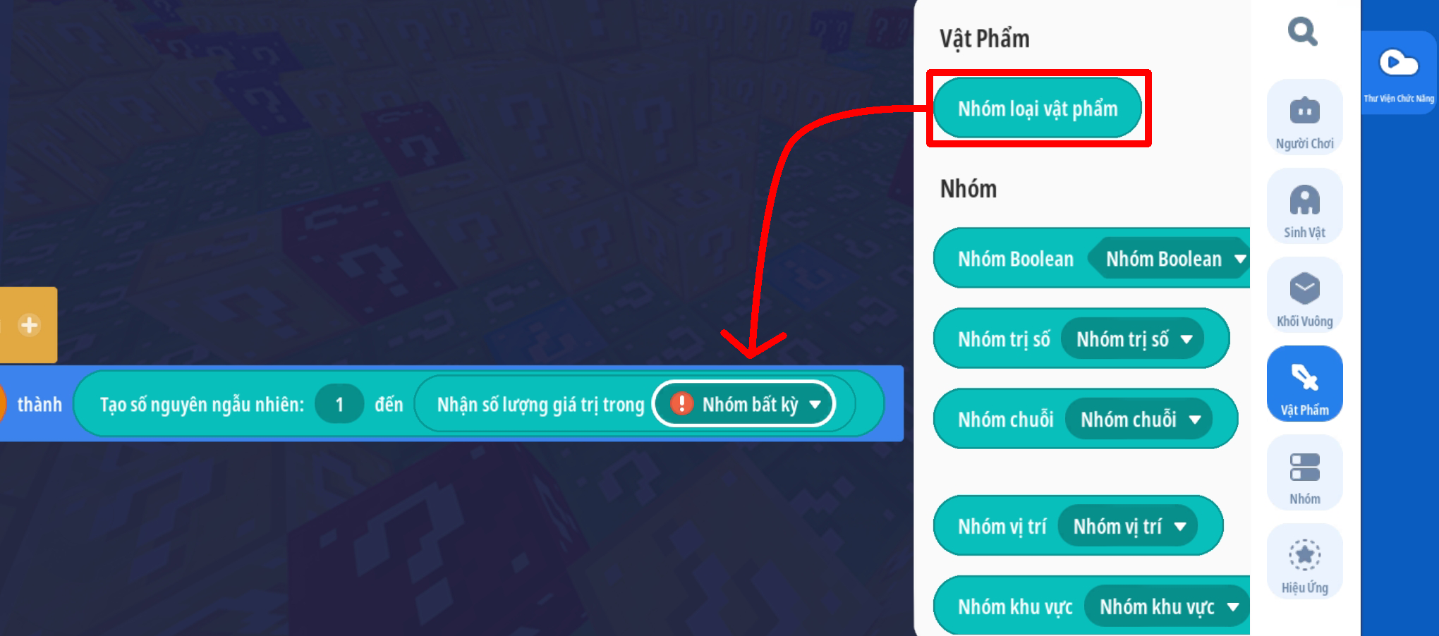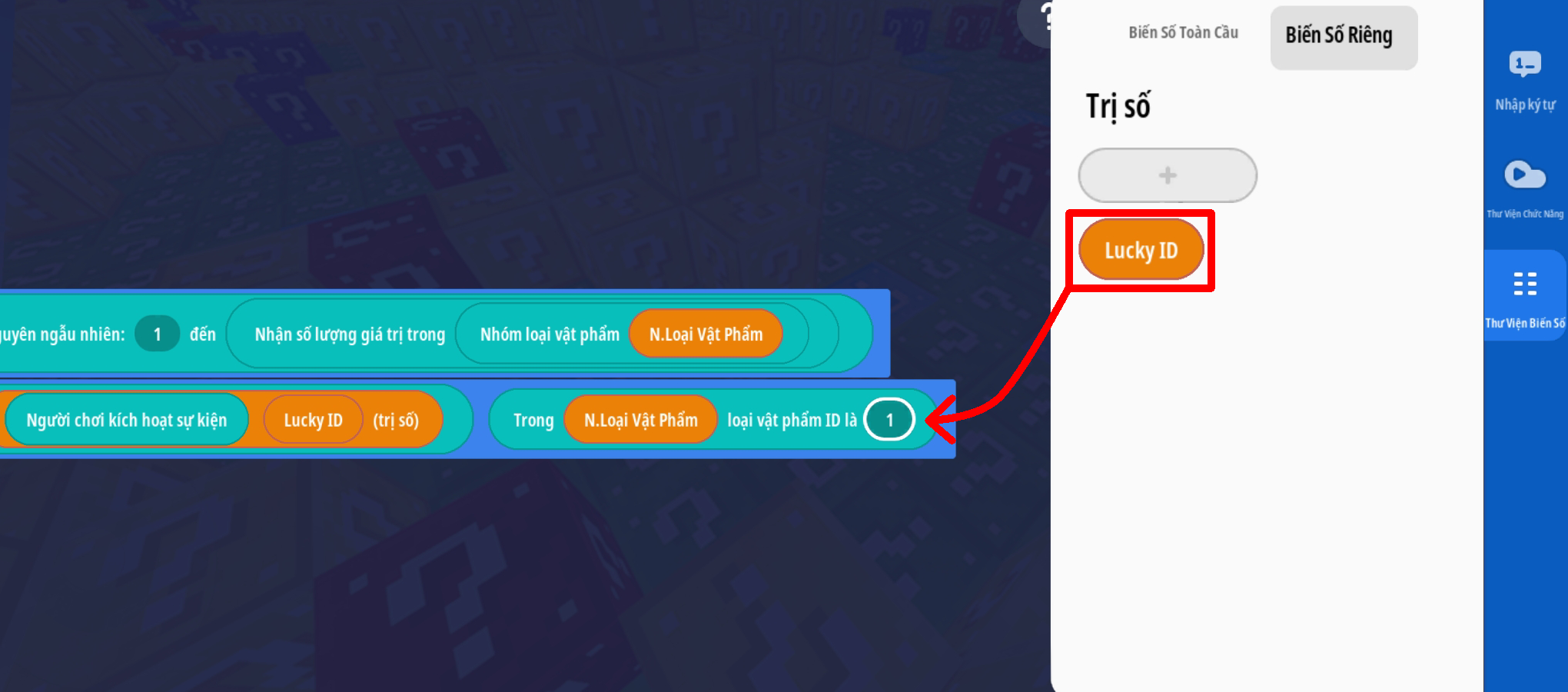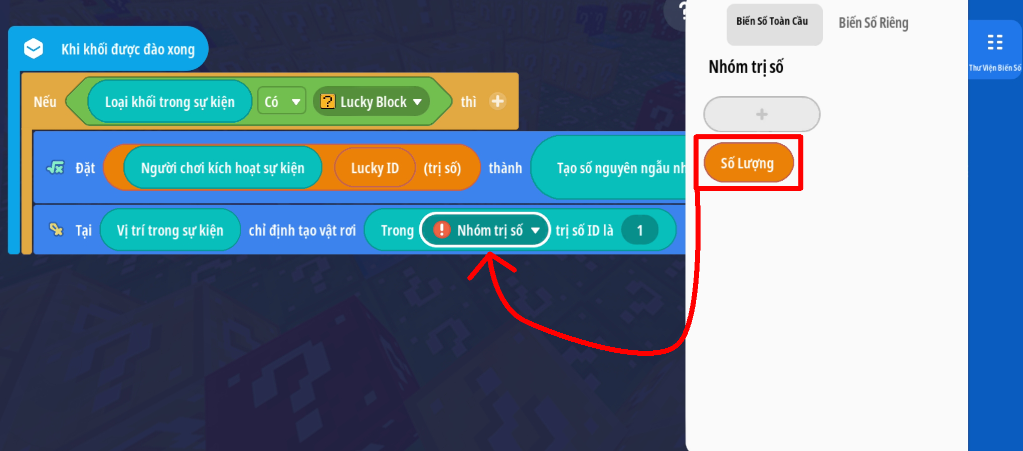- Bước 1: Tạo biến nhóm loại khối. Thêm các khối sử dụng làm phần thưởng