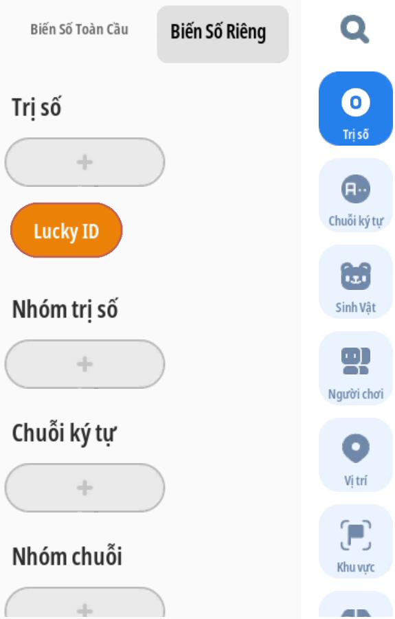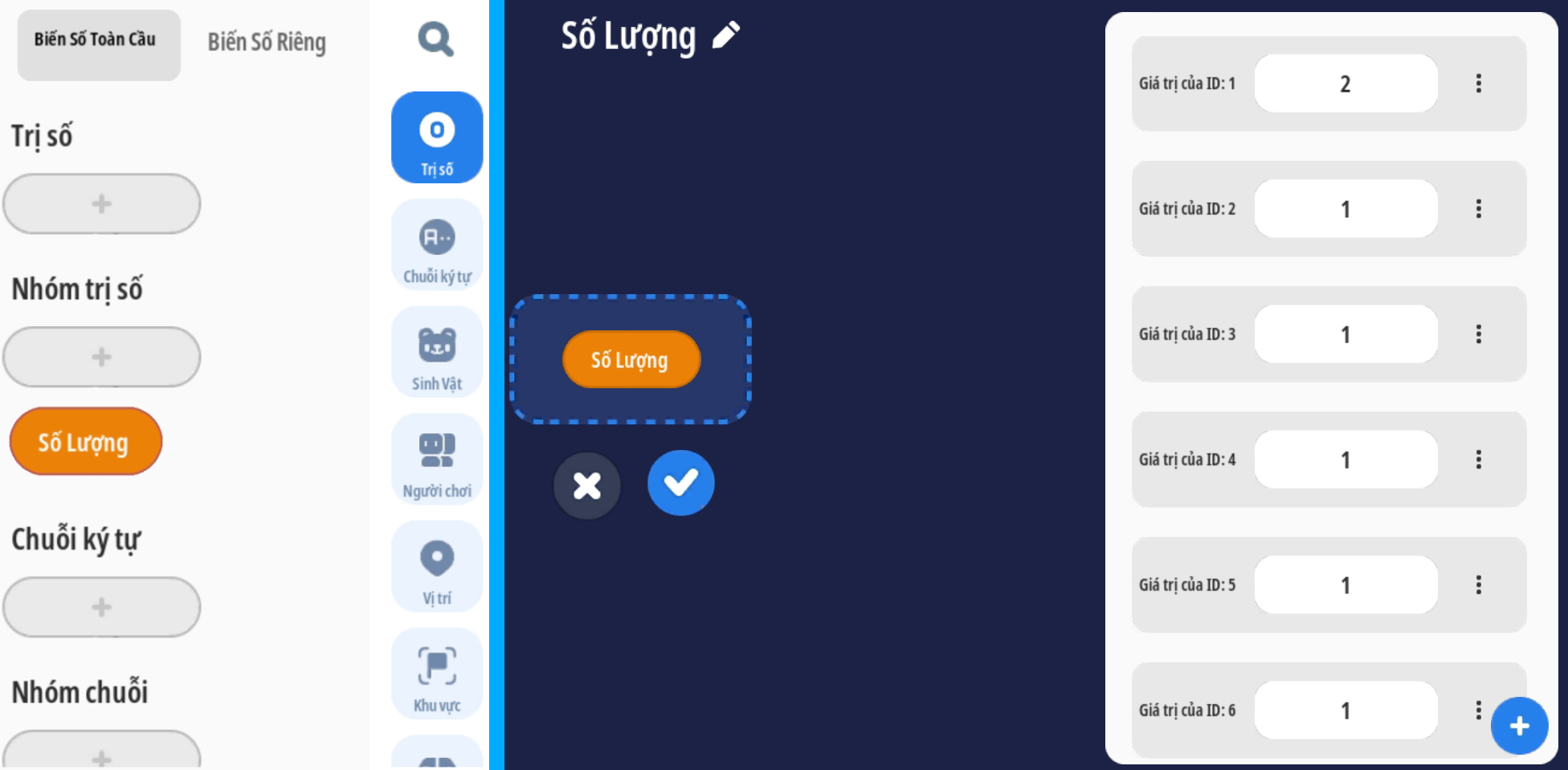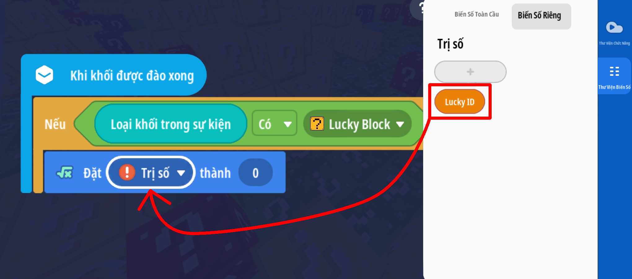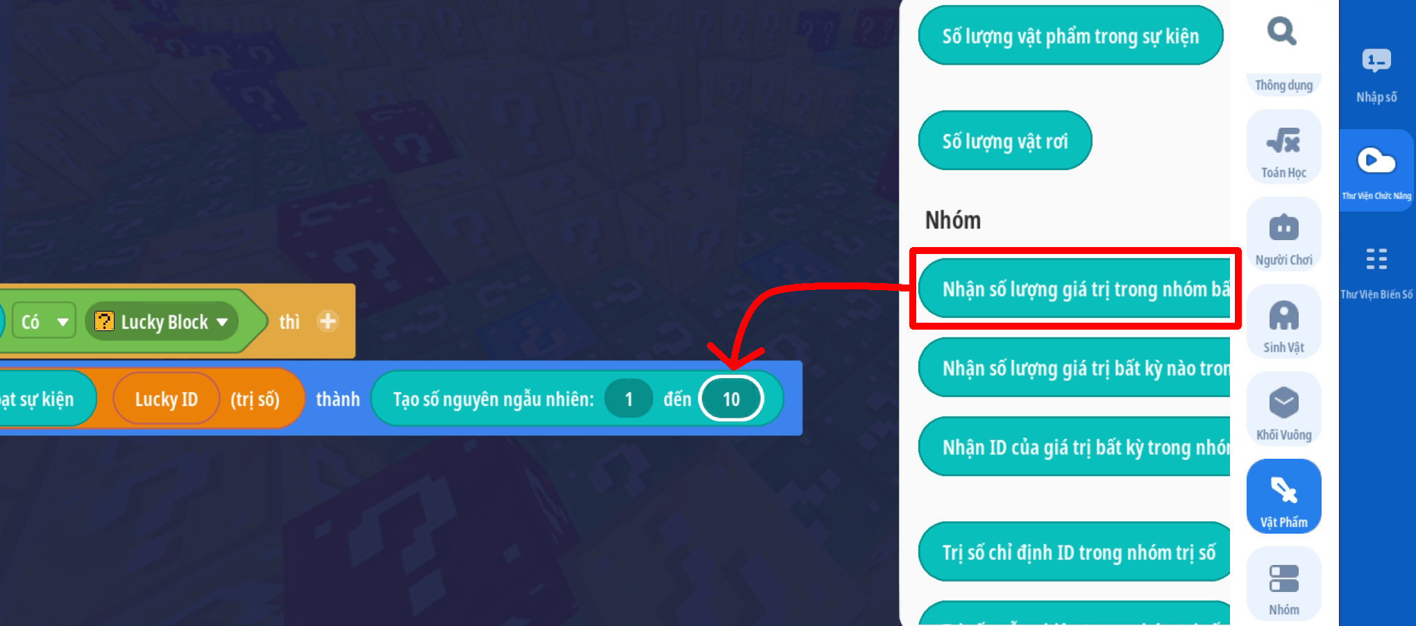 - Bước 1: Tạo biến nhóm loại khối. Thêm các khối sử dụng làm phần thưởng