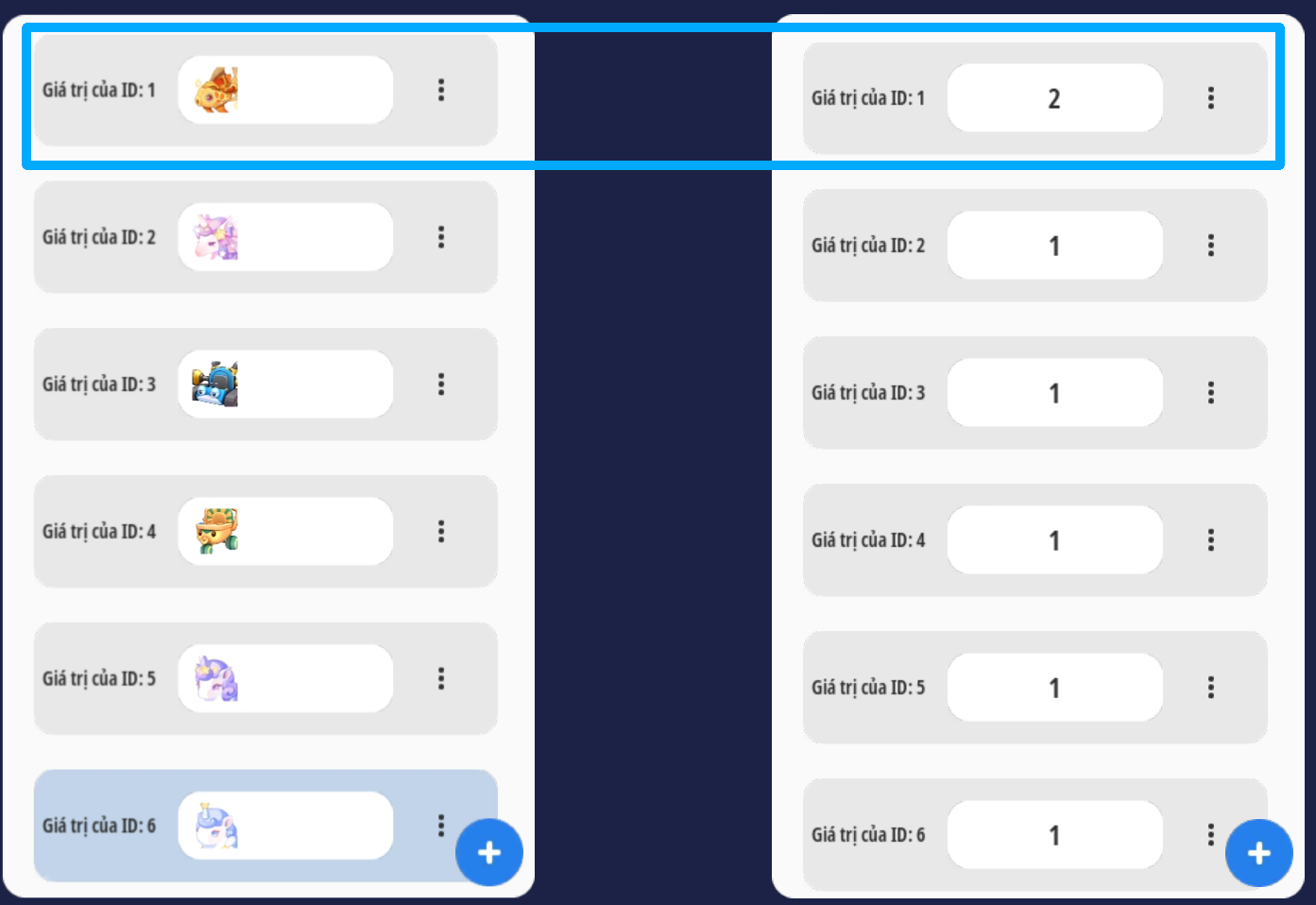 Tạo biến nhóm trị số. Thêm các giá trị theo số lượng vật phẩm muốn tạo, sắp xếp theo ID tương ứng với ID vật phẩm trong nhóm loại vật phẩm.