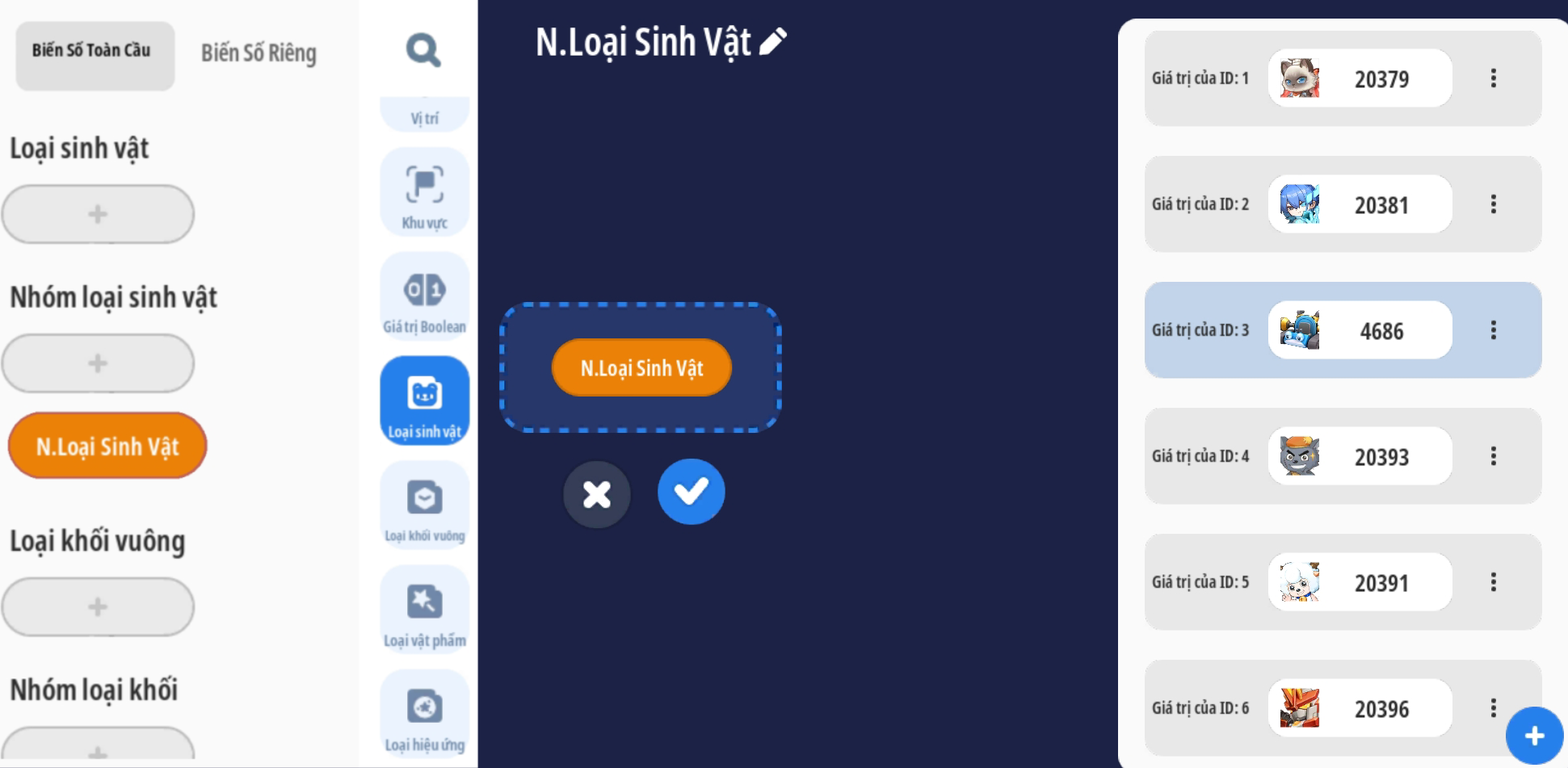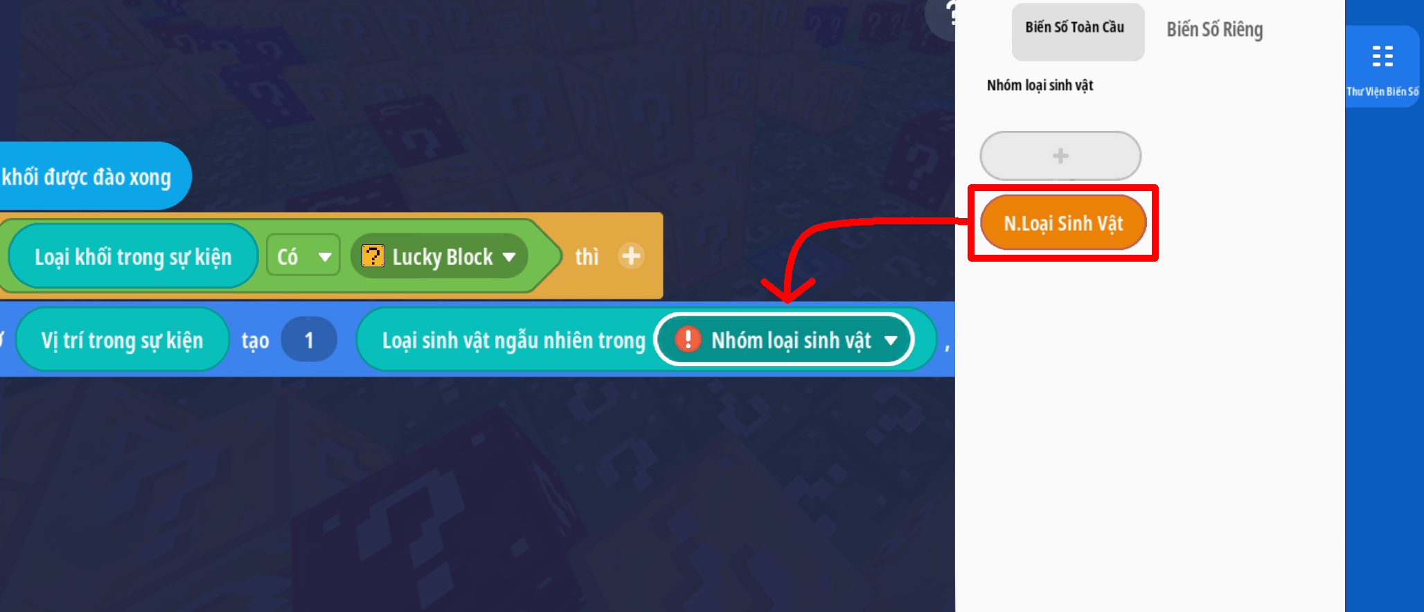 - Bước 1: Tạo biến nhóm loại sinh vật. Thêm các sinh vật sử dụng làm phần thưởng