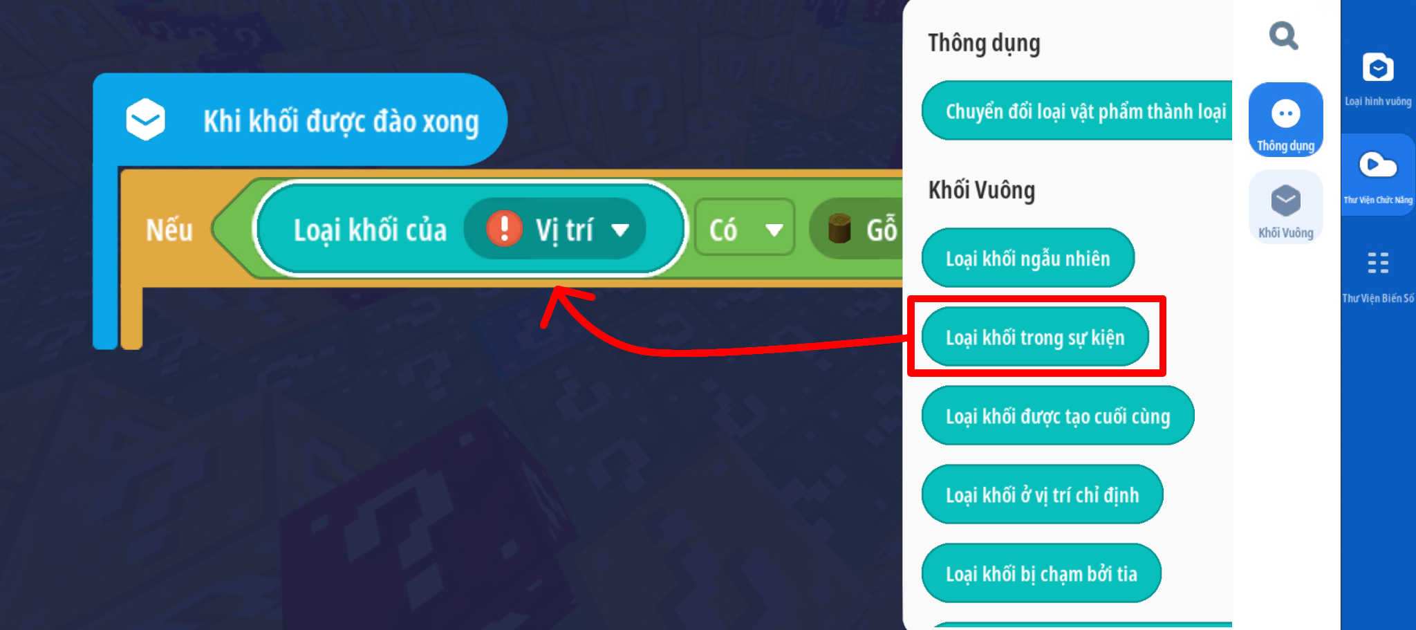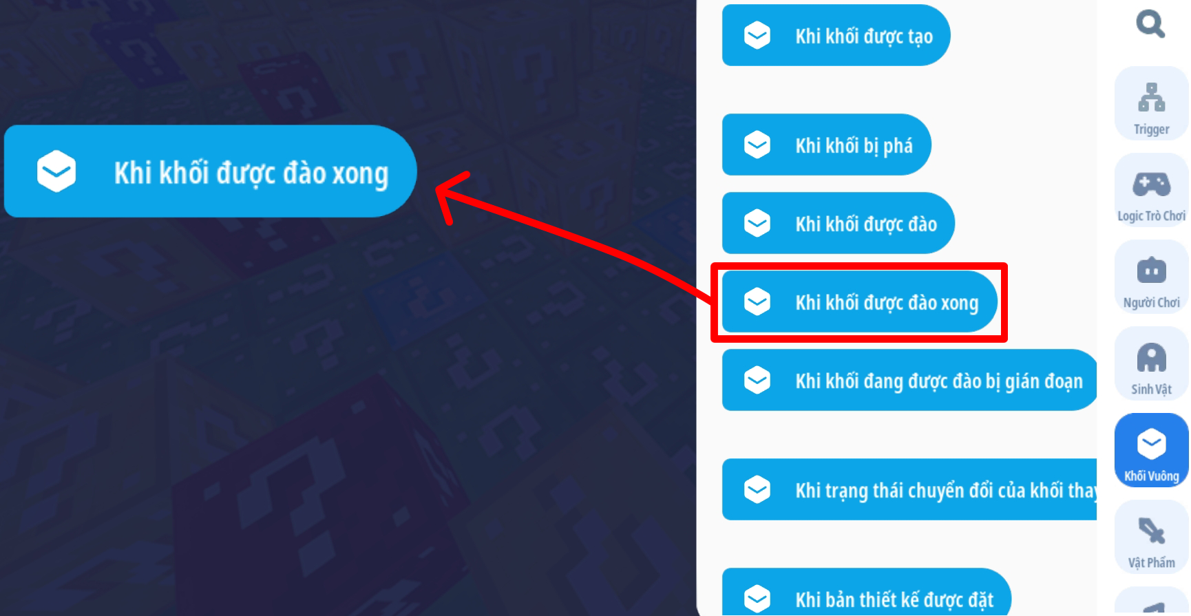 - Bước 2: Tạo sự kiện liên quan đến tác động vào khối vuông. Bản mẫu sẽ sử dụng sự kiện phá khối