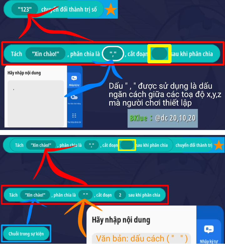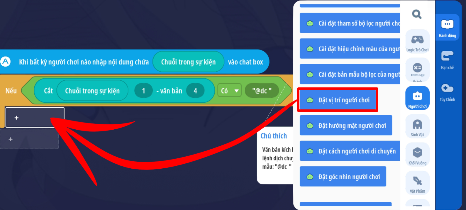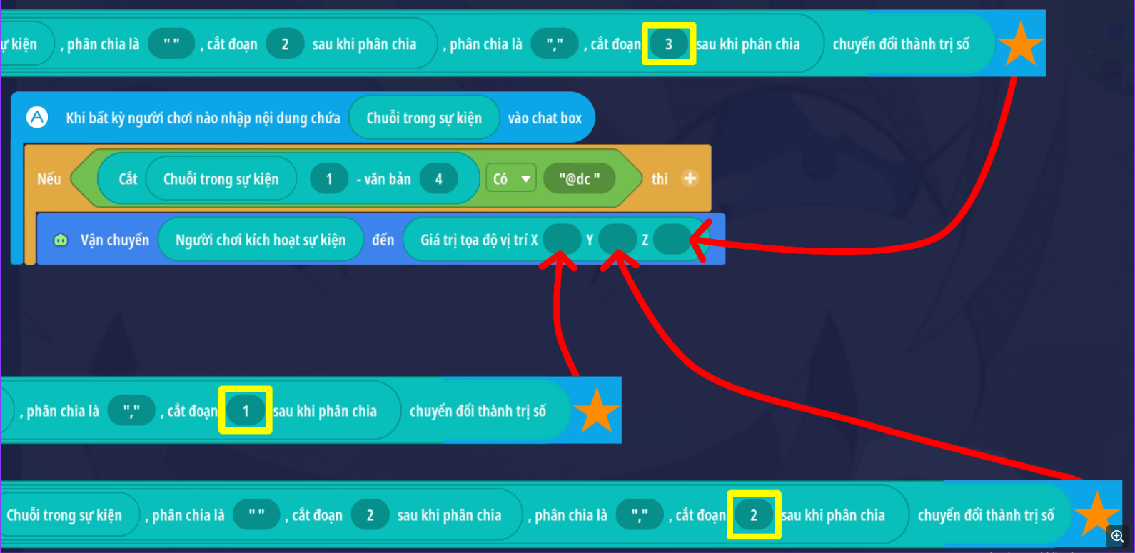 Khi người chơi chat mã lệnh theo cách thức: @dc 'toạ độ X','toạ độ Y','toạ độ Z'