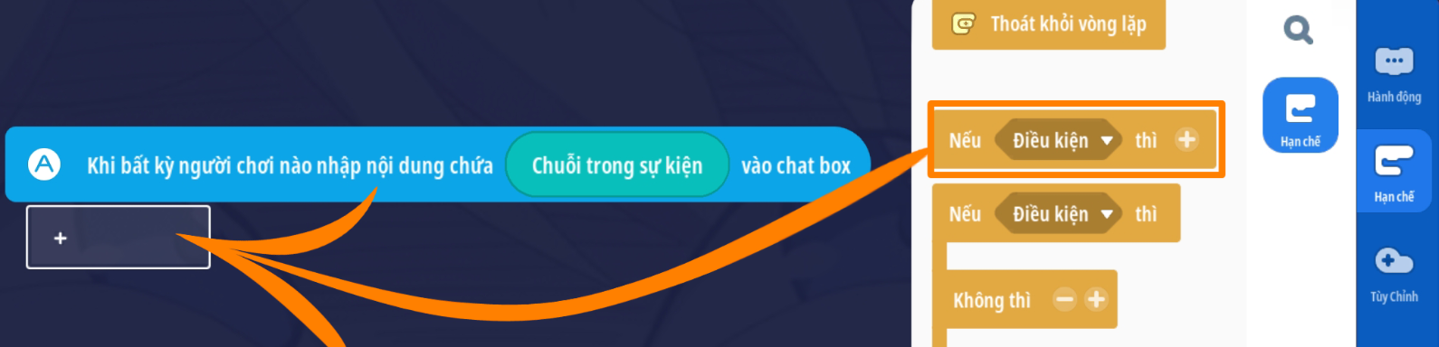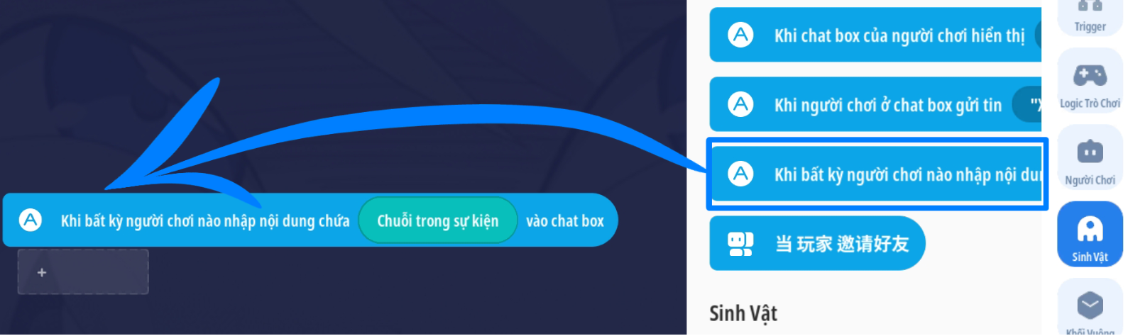 - 1/ Tạo 1 sự kiện liên quan đến đoạn chat để kích hoạt trigger, có thể thành thành các sự kiện khác có chứa chuỗi