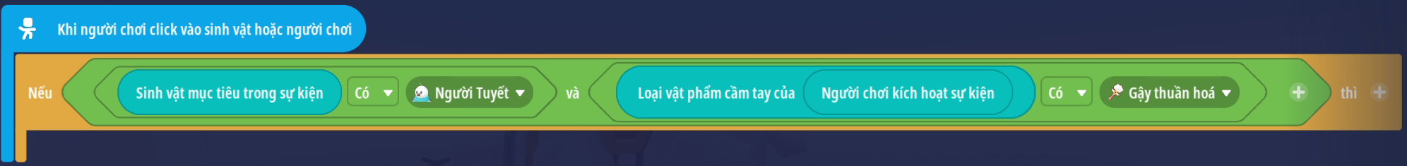 - Tạo sự kiện với 2 điều kiện vật phẩm cần tay là vật phẩm chỉ định và sinh vật mục tiêu là sinh vật cần thuần hoá