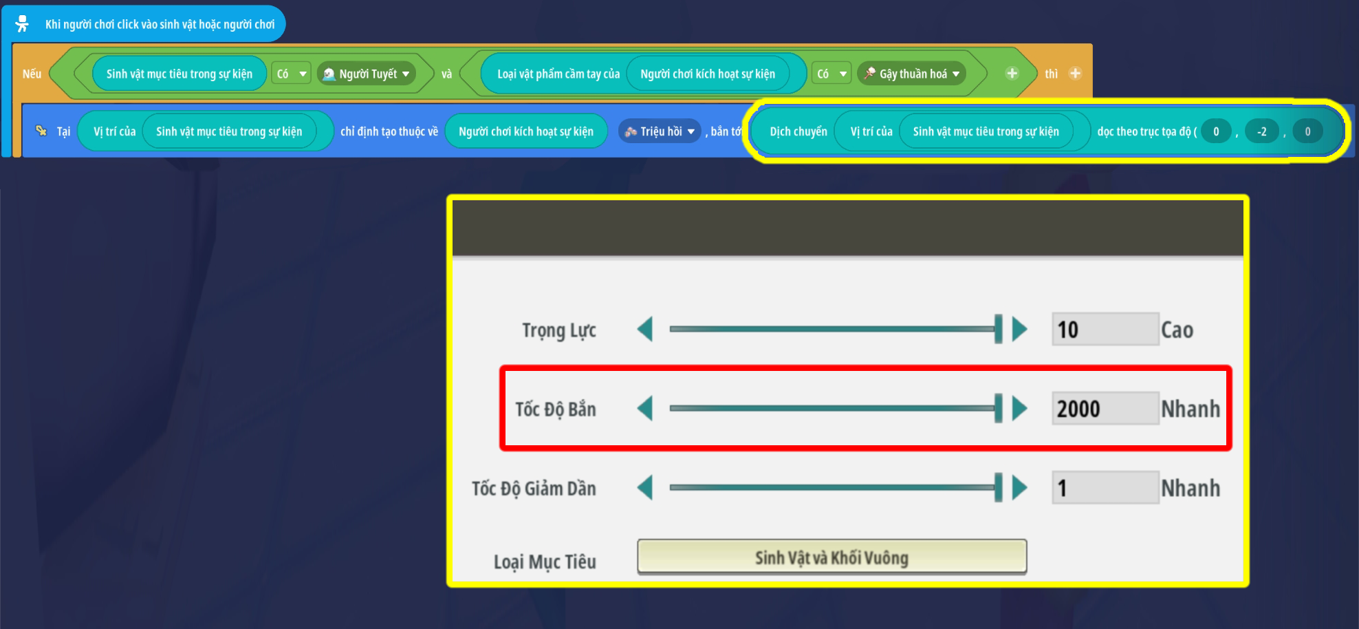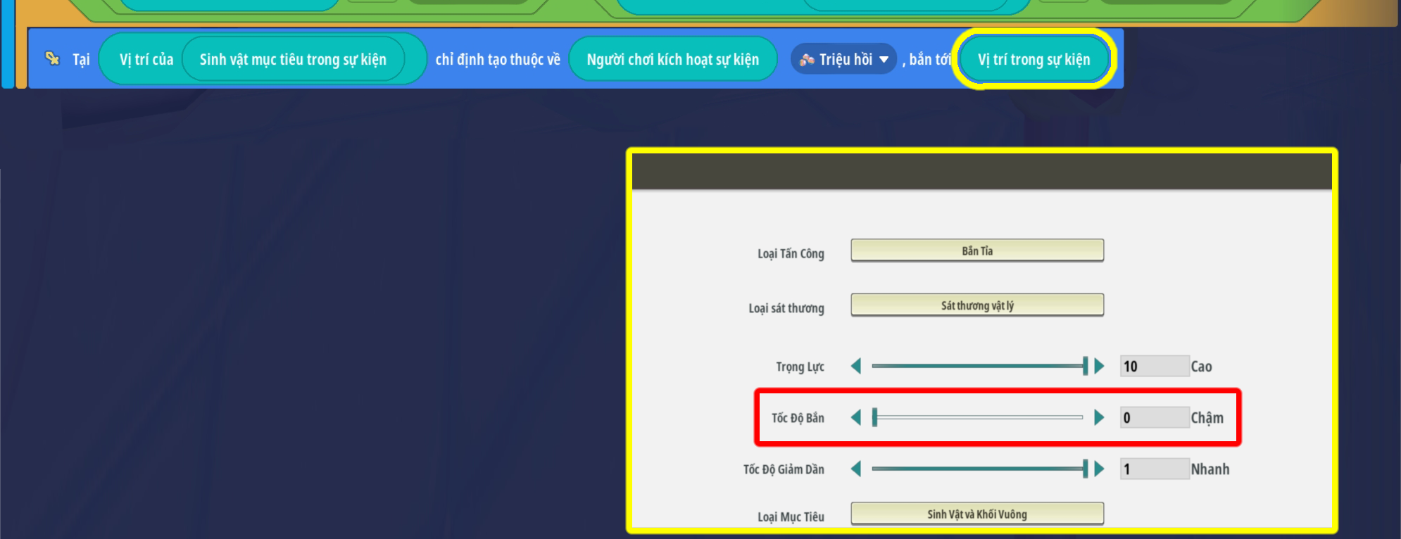 - Lưu ý: Đặt tới vị trí sự kiện nên sử dụng tốc độ bắn nhỏ để vật ném rơi xuống tại vị trí sinh vật ( Sẽ gây ra khoảng trì hoãn )