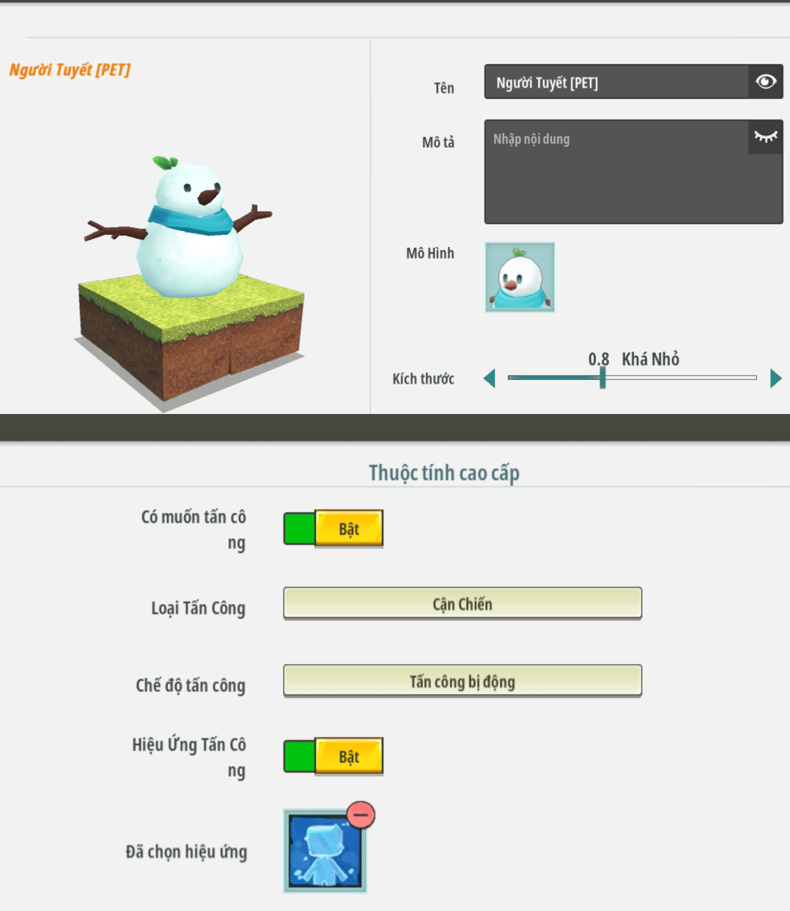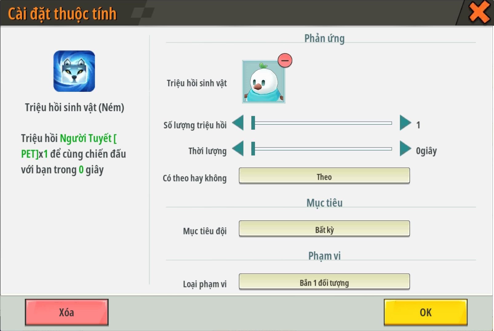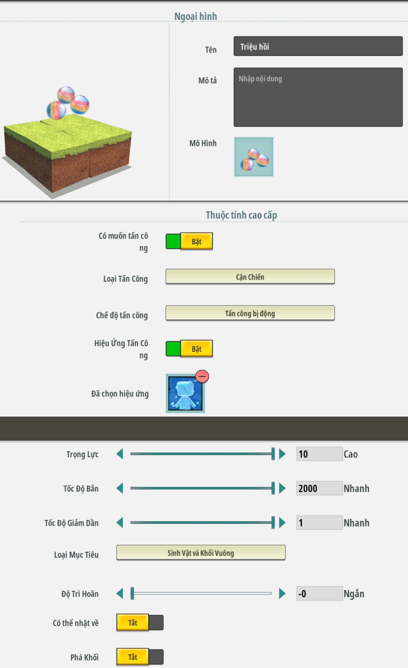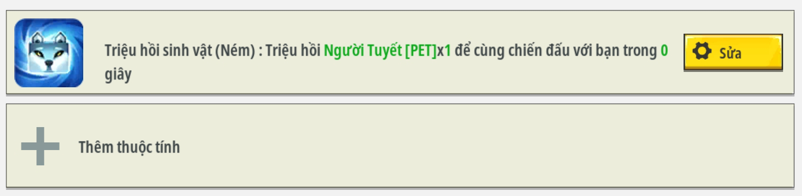 - Tạo vật ném kèm thuộc tính nâng cao triệu hồi sinh vật đã thuần hoá. Chỉnh thuộc tính tốc độ phù hợp, sẽ có lưu ý thêm trong hướng dẫn bên dưới