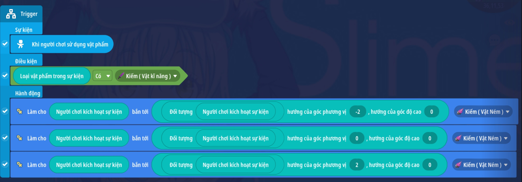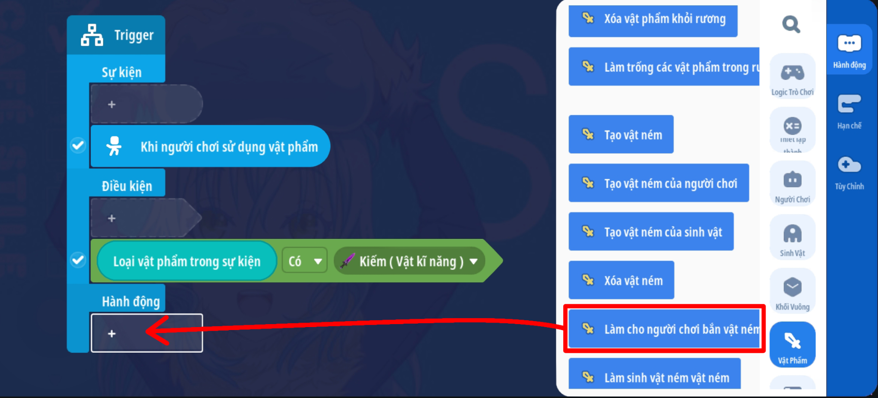 - Bước 2: Tạo sự kiện người chơi sử dụng vật phẩm