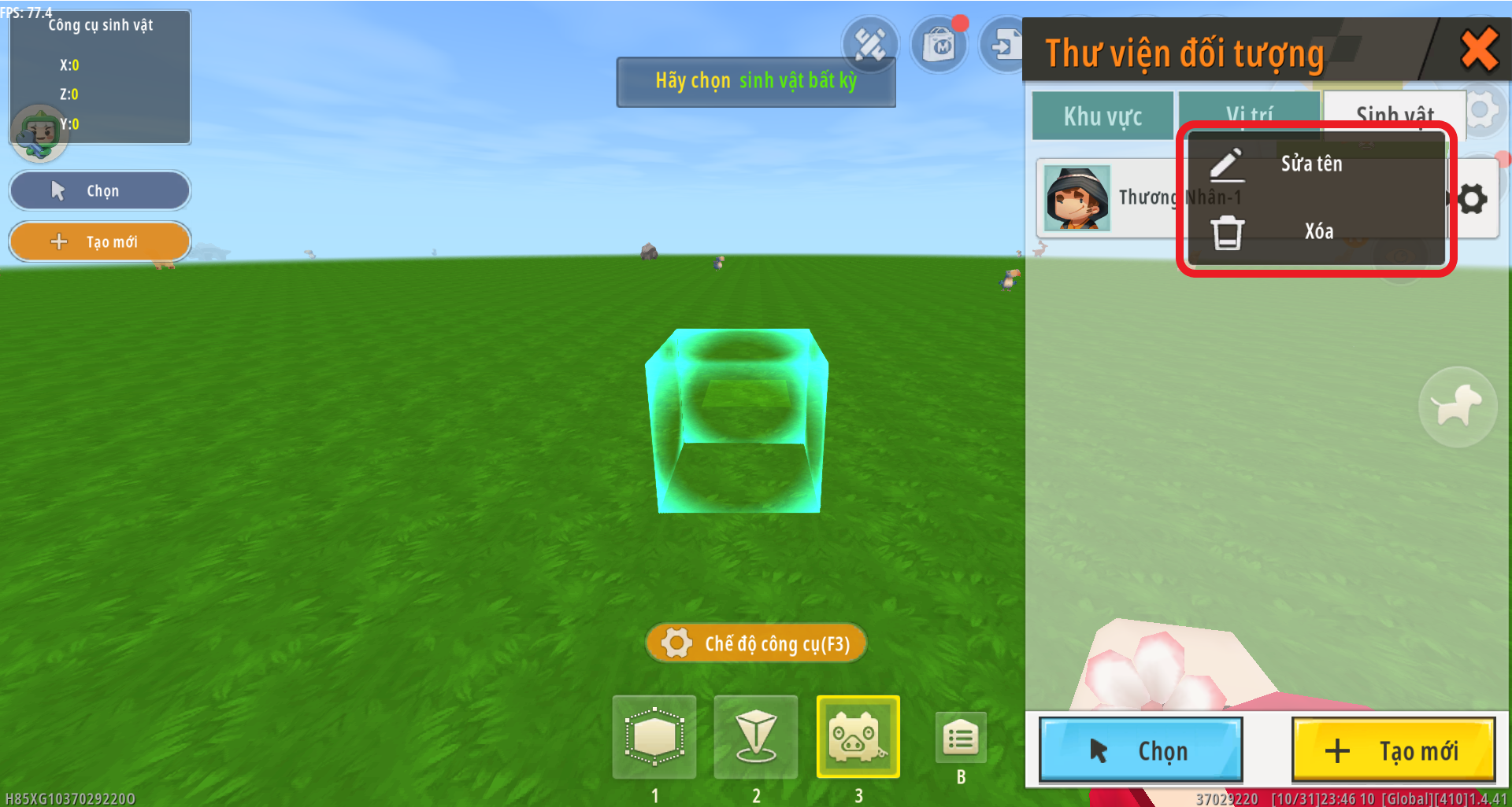 Chúng ta có thể tạo và chọn các đối tượng ở đây.