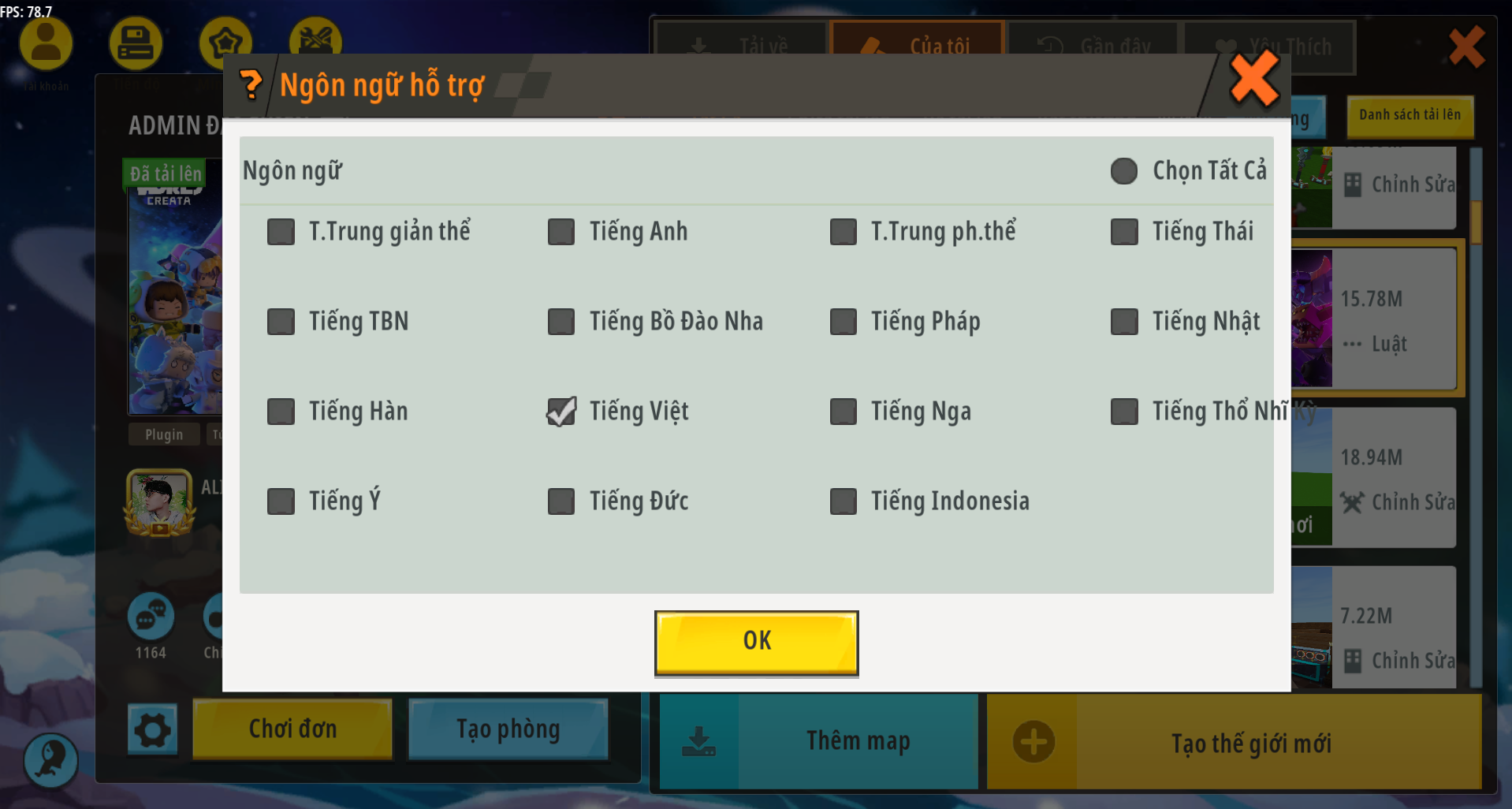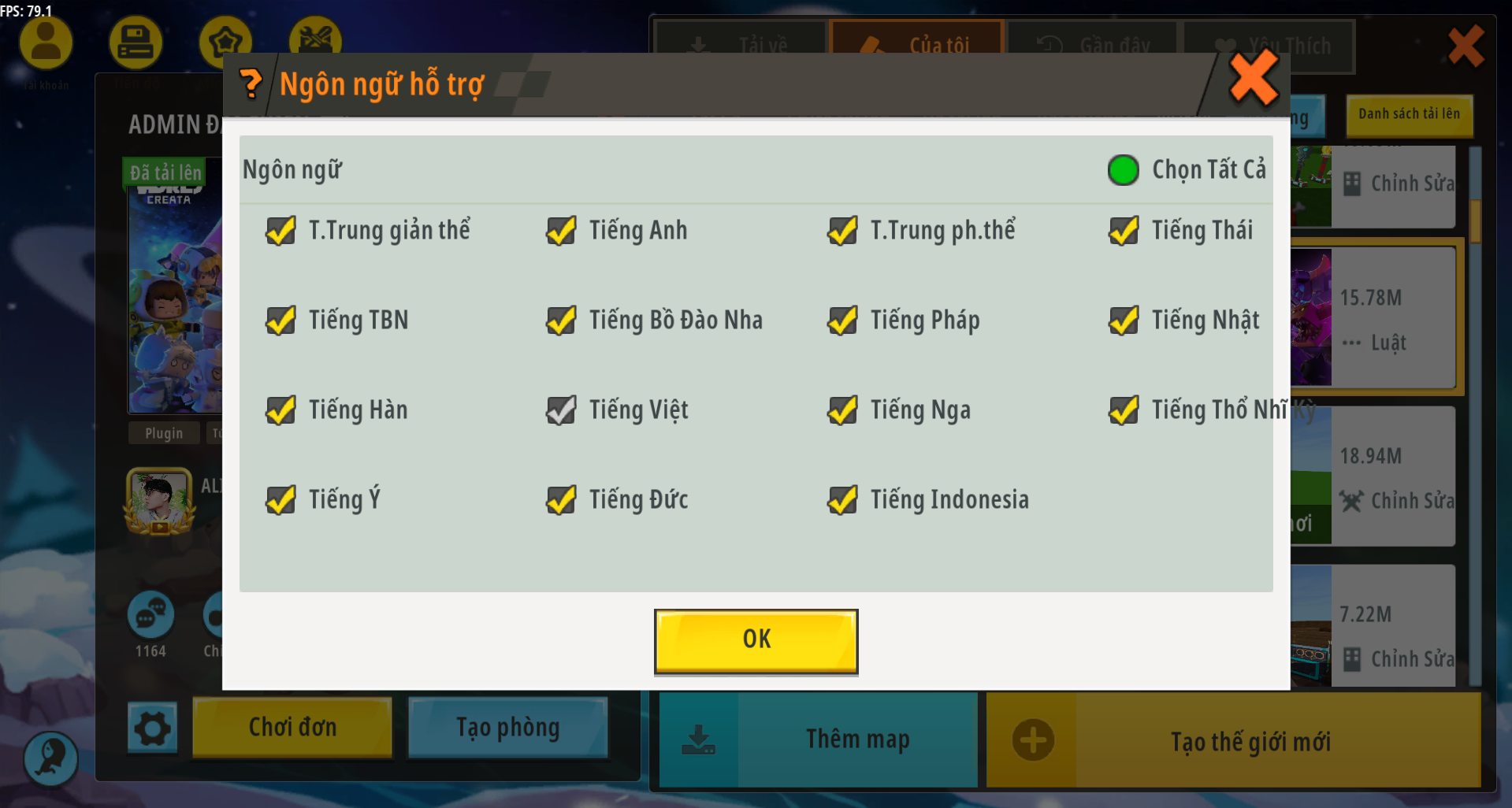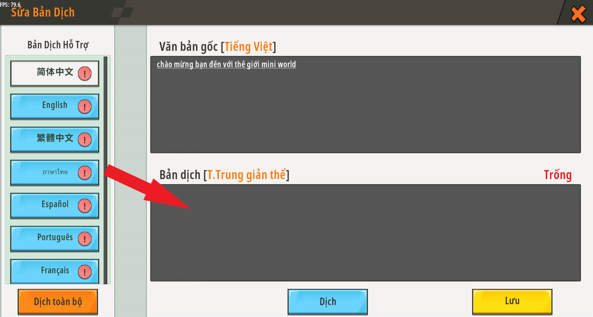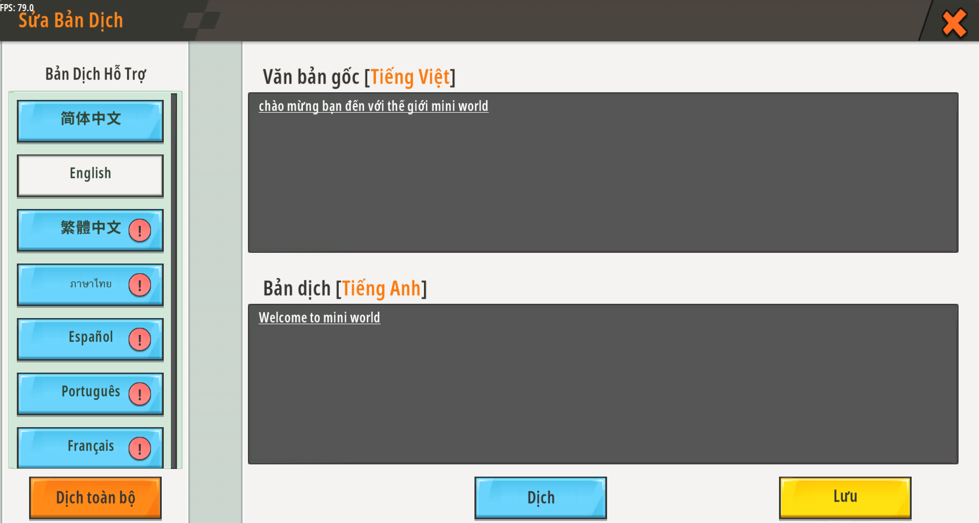 Sau khi bạn sử dụng chức năng dịch, nút chỉnh sửa bản dịch sẽ hiển thị ở tất cả các địa điểm nhập văn bản trên bản đồ. Nhấp vào nút để dịch ngôn ngữ đầu vào sang bất kỳ ngôn ngữ nào khác mà bạn muốn trực tuyến. Khi những người khác vào bản đồ, họ có thể chọn chơi bằng một trong những ngôn ngữ mà người tạo bản đồ đã thiết lập.