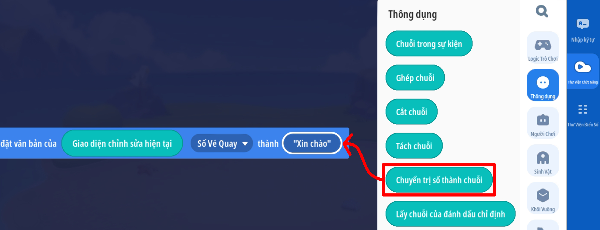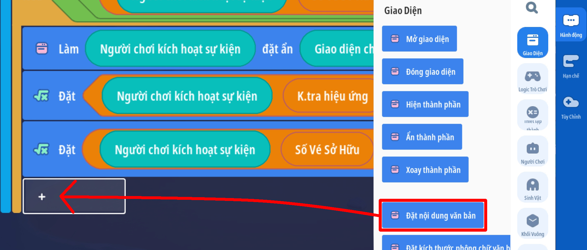 - Tạo sự kiện để mở cửa hàng ( Tuy chức năng mỗi bản đồ). Thêm hành động đặt nội dung văn bản: 'Số Vé Quay' thành giá trị biến riêng: “Số Vé Sở Hữu” để cập nhật số vé hiện có trước khi mở giao diện ( Sử dụng hiệu ứng sẵn có của trò chơi để khi mở cửa hàng trở lên sống động hơn )