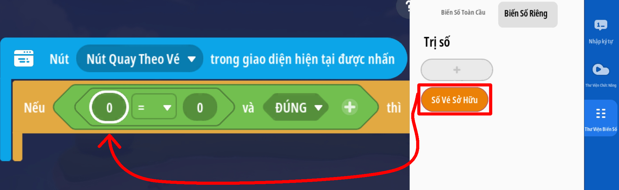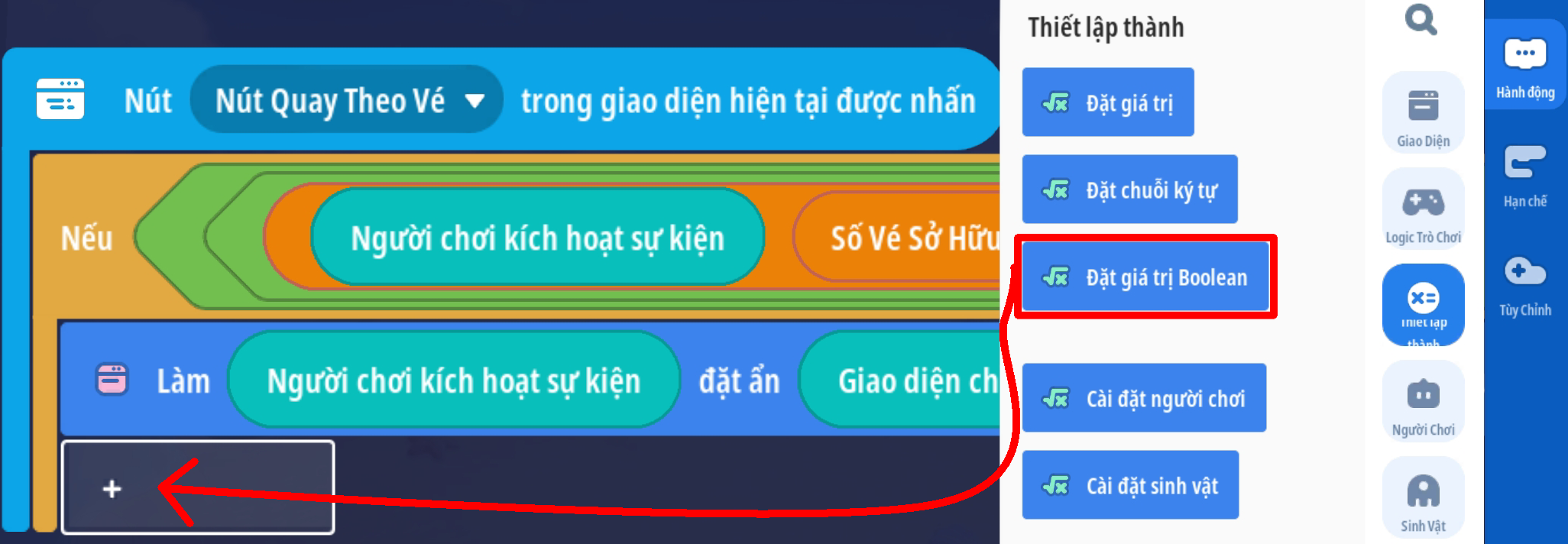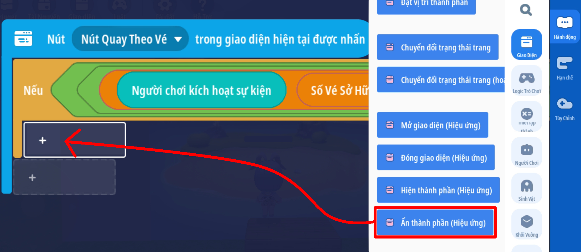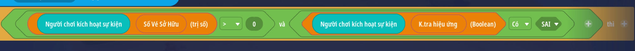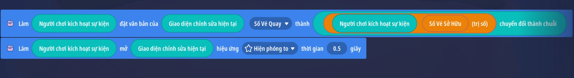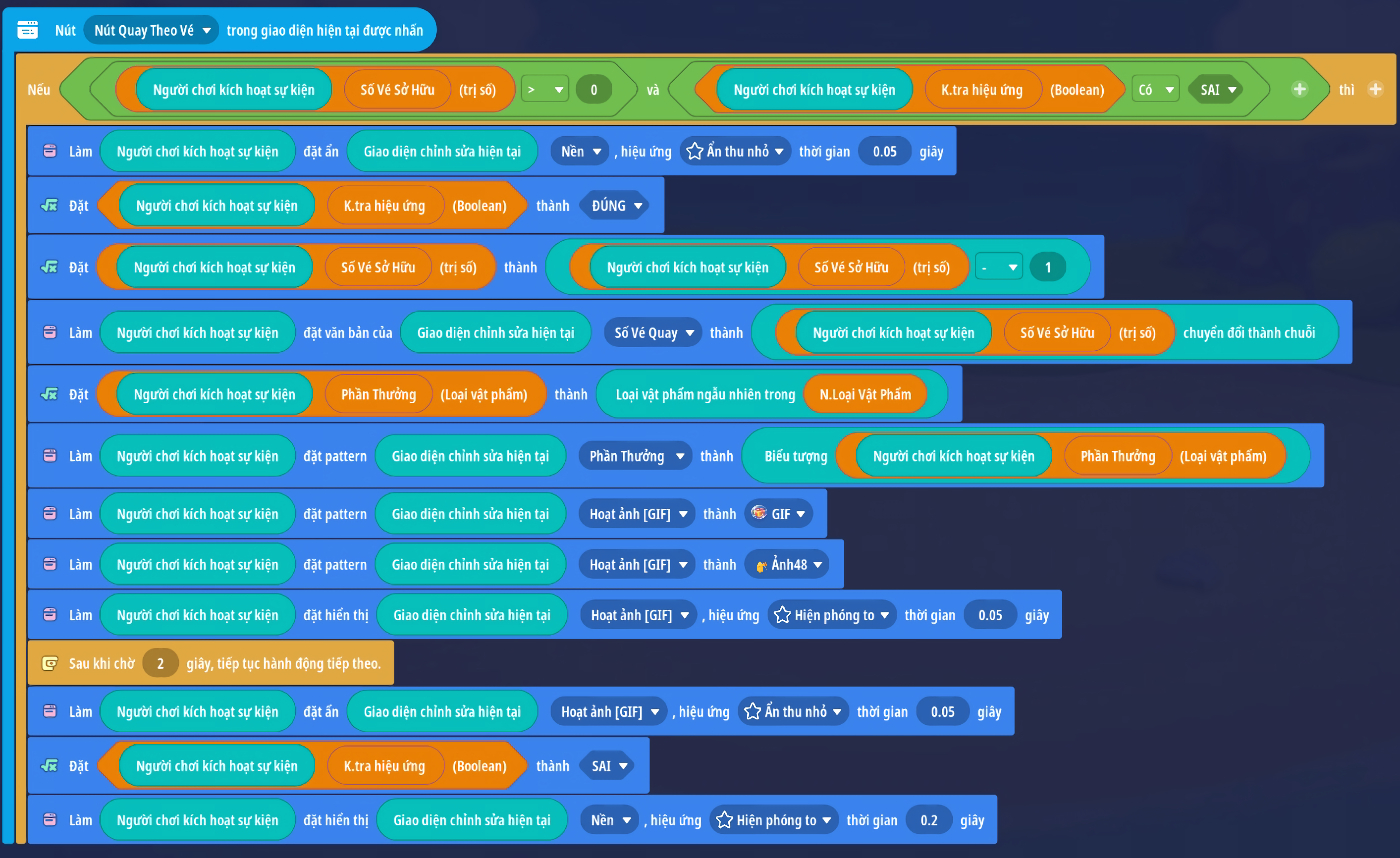 - Tạo sự kiện người chơi ấn nút: 'Quay Theo Vé' với 2 điều kiện: