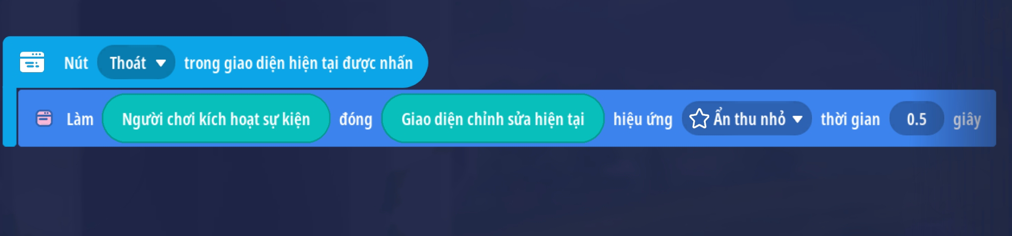 - Tạo sự kiện người chơi ấn nút 'Thoát' sẽ đóng giao diện ( Sử dụng hiệu ứng sẵn có của trò chơi để khi đóng cửa hàng trở lên sống động hơn )