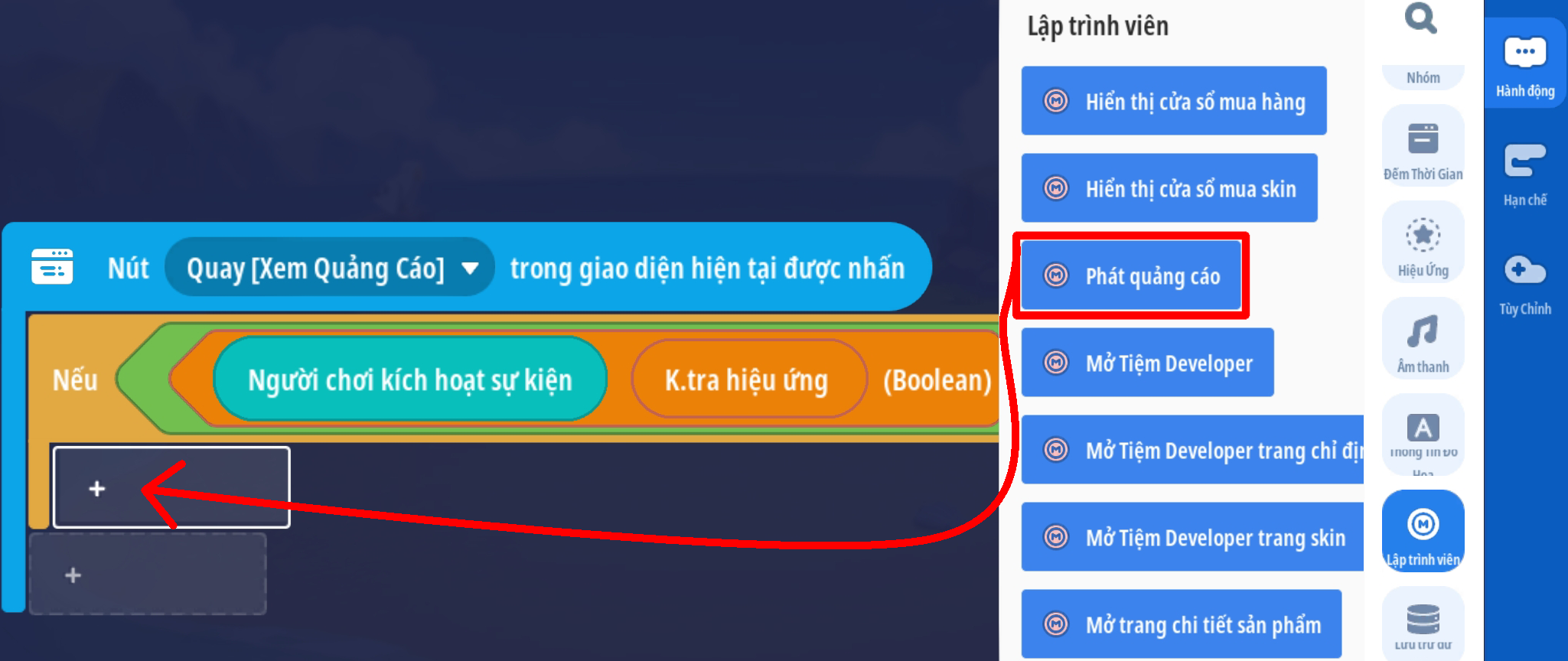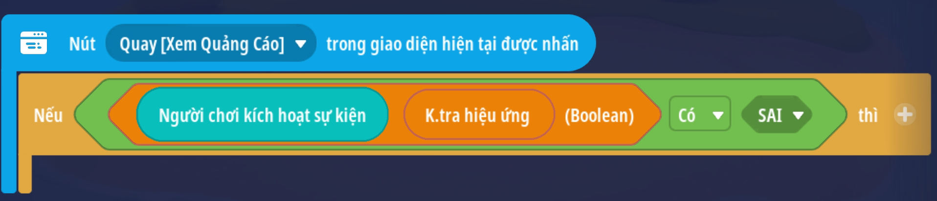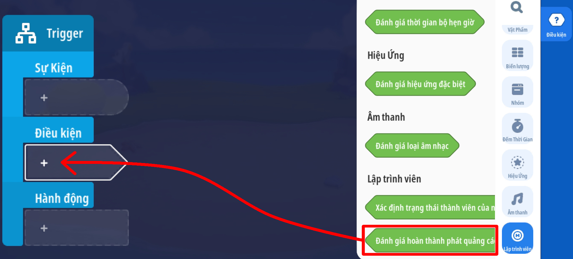 - Tạo trigger người chơi nhấp nút xem quảng cáo sẽ phát quảng cáo với trigger đã tạo bên trên