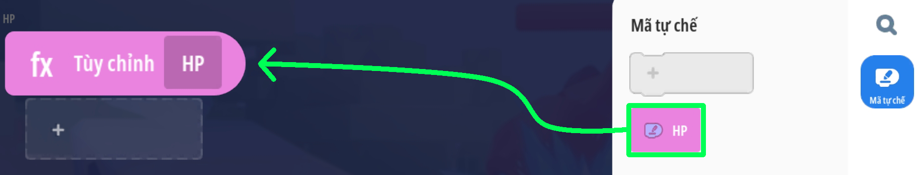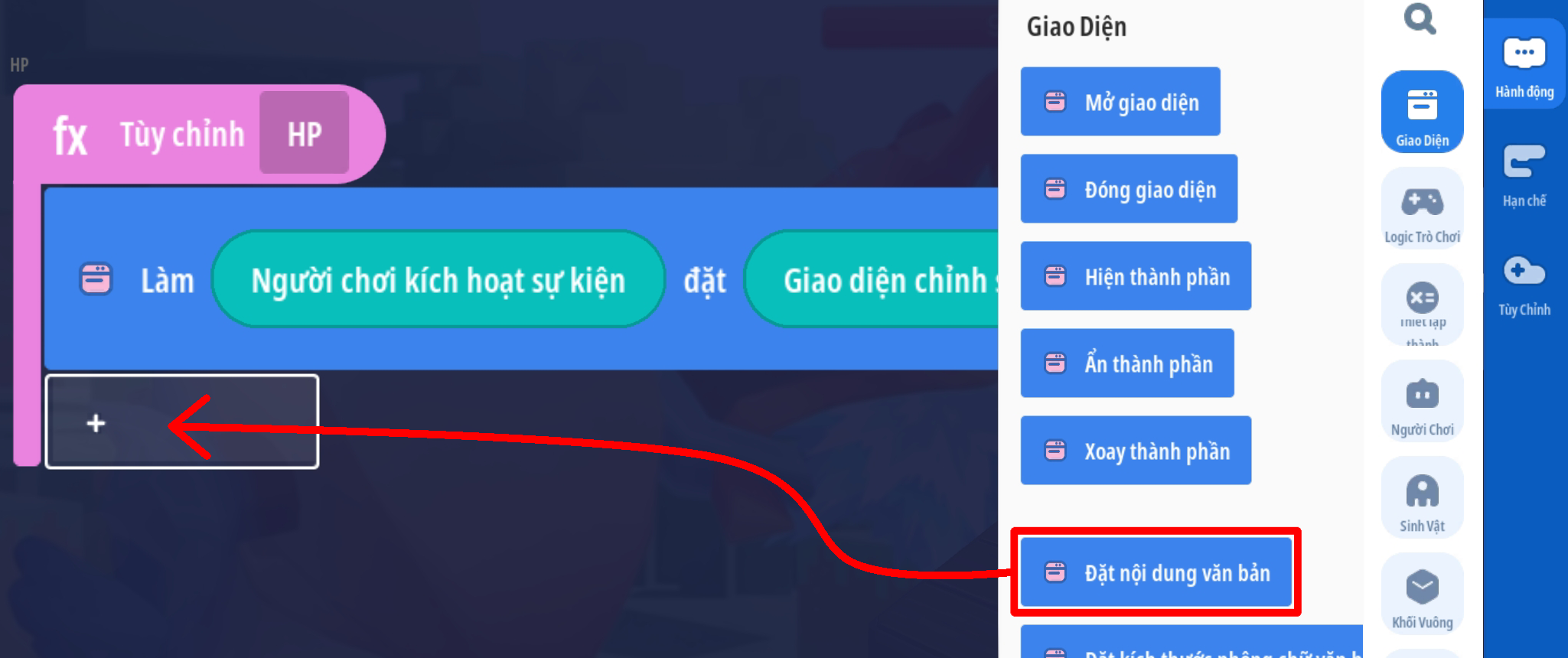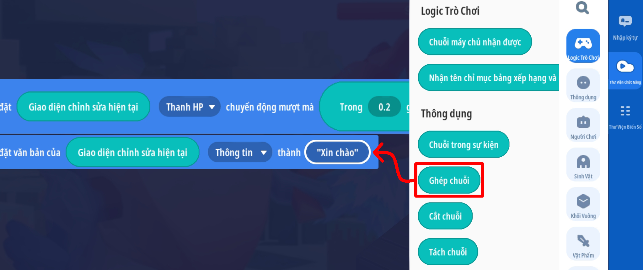 - Ô chuỗi 3: chuyển đổi giá trị (thuộc tính HP hiện tại của người chơi) thành chuỗi