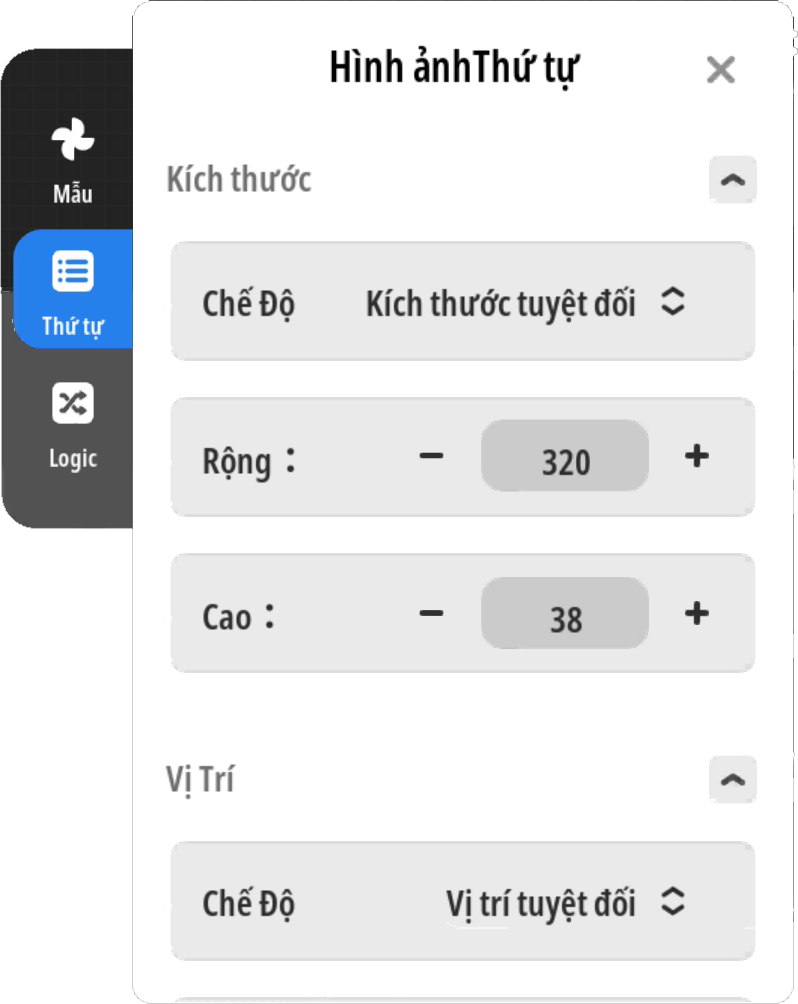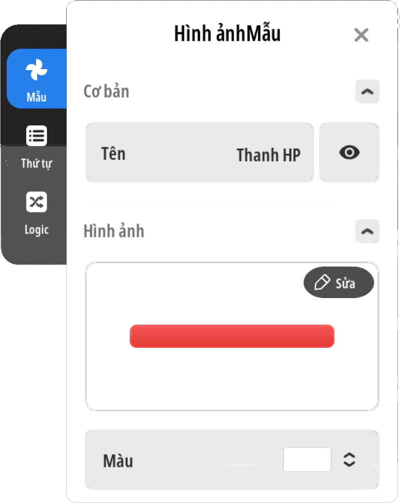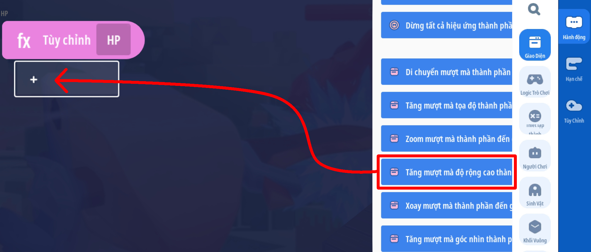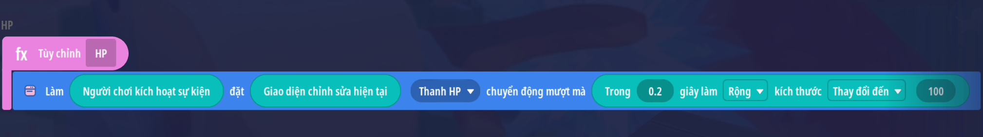 - Bước 2: Thêm thêm hành động thay đổi kích thước UI, thiết lập thay đổi kích thước UI “Thanh HP” với thời gian thích hợp thay đổi đến giá trị: Chiều rộng tối đa ban đầu thiếp lập ( theo mẫu là 320 ) × [ Giá trị HP hiện tại của người chơi ÷ Giá trị HP tối đa của người chơi ]