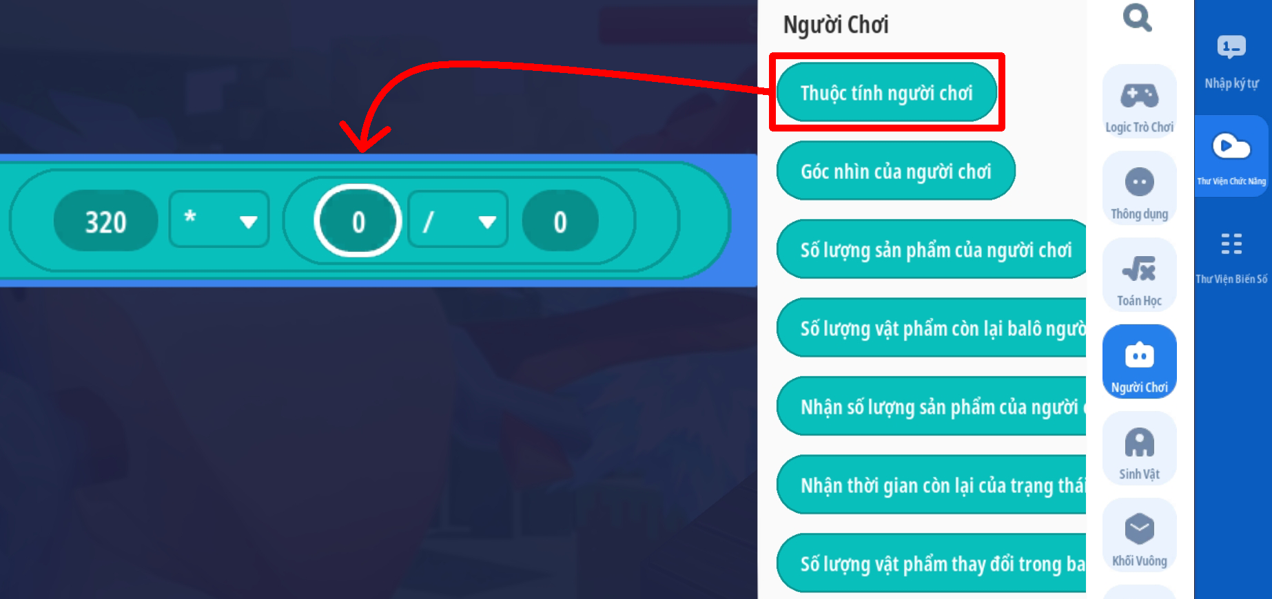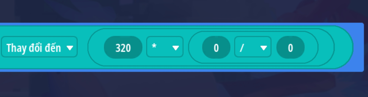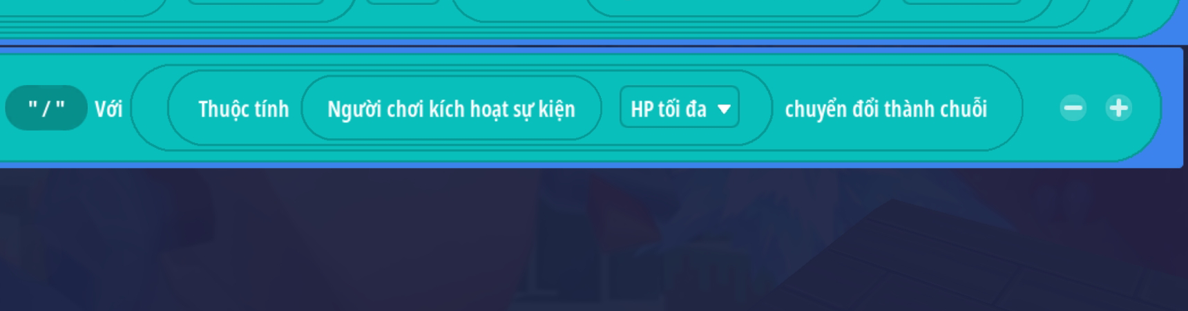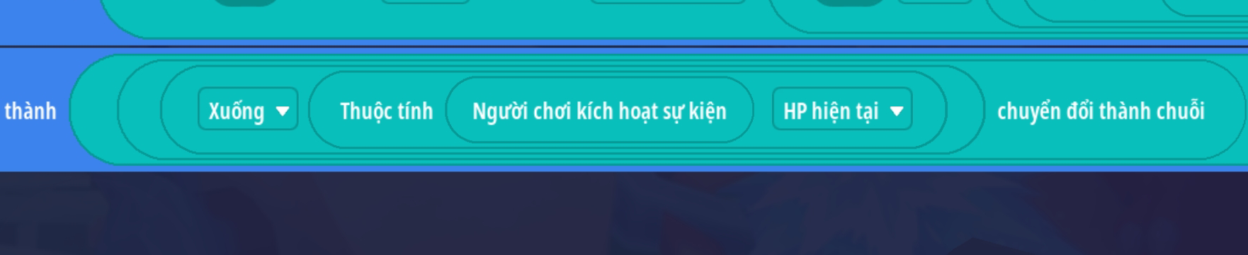- Ô chuỗi 1: chuyển đổi giá trị [ (thuộc tính HP hiện tại của người chơi) làm tròn xuống] thành chuỗi