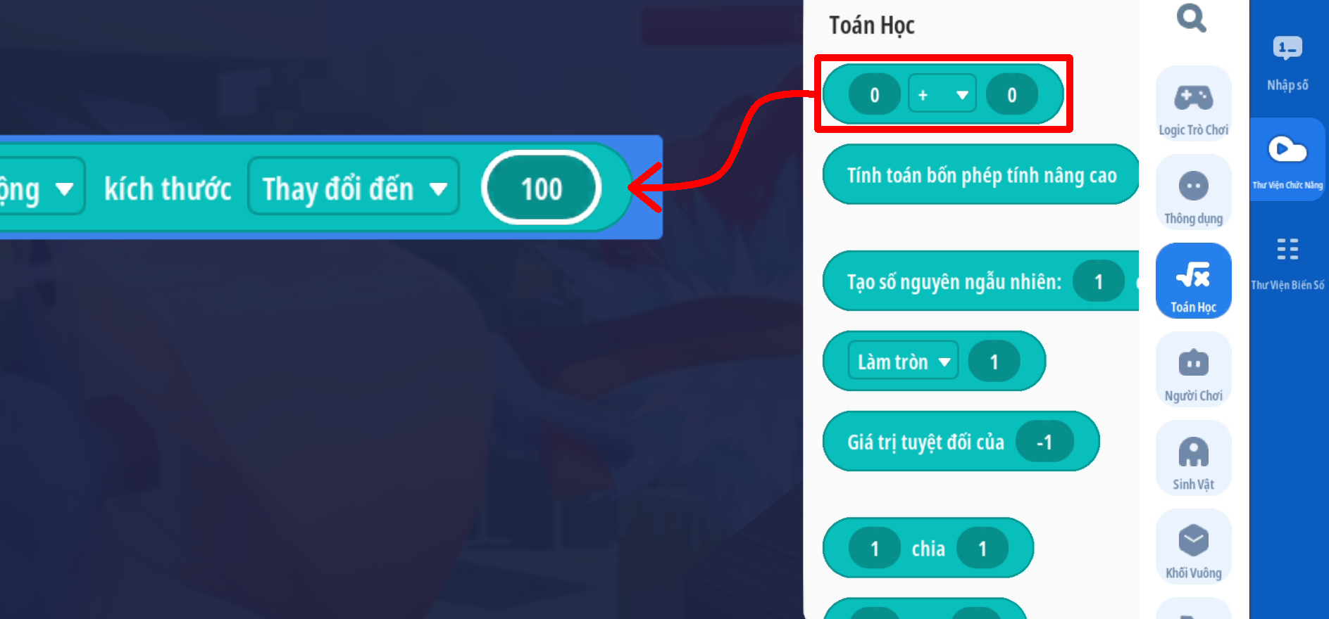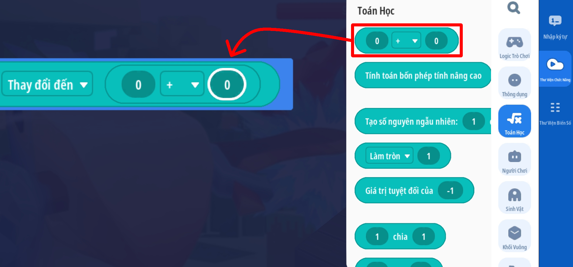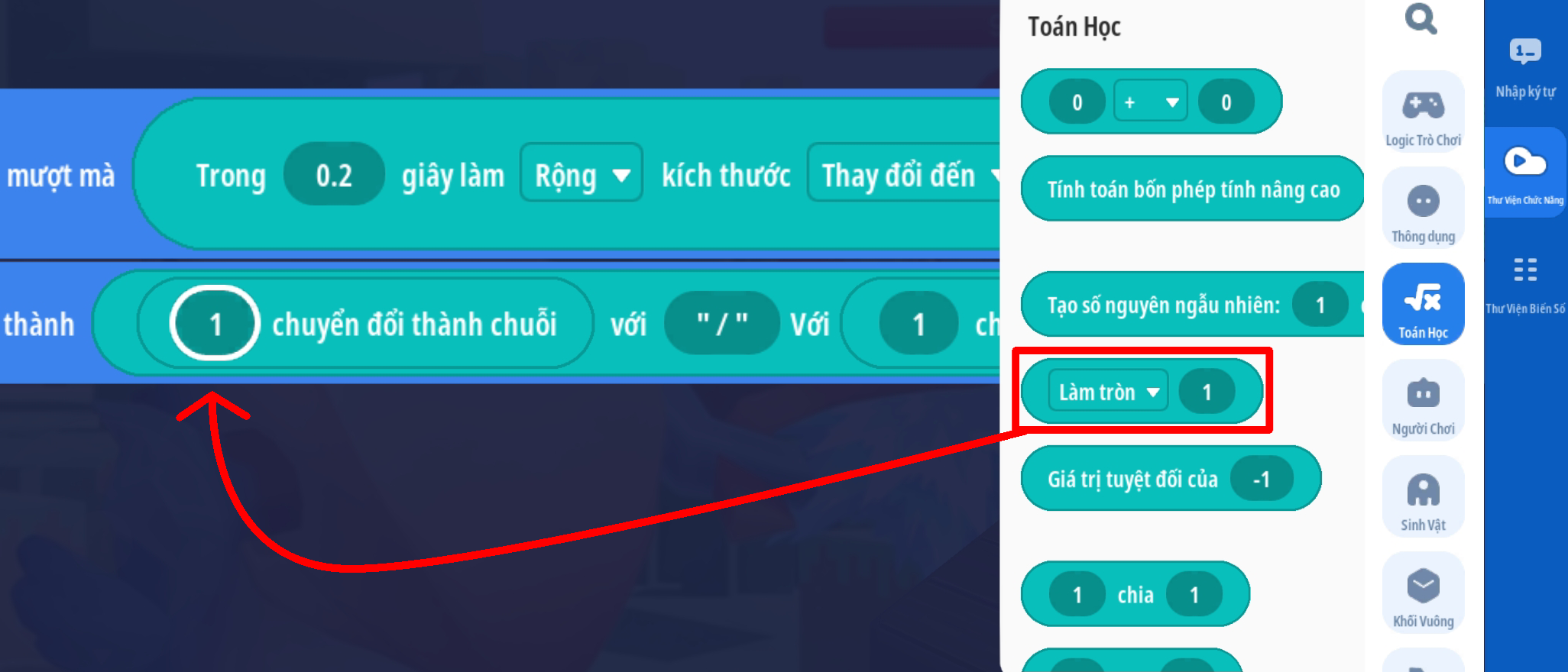 - Ô chuỗi 1: chuyển đổi giá trị [ (thuộc tính HP hiện tại của người chơi) làm tròn xuống] thành chuỗi