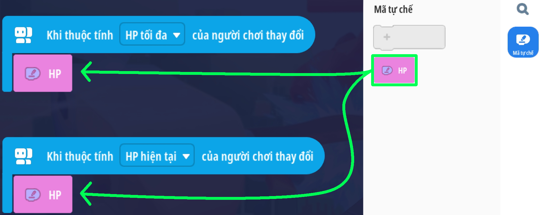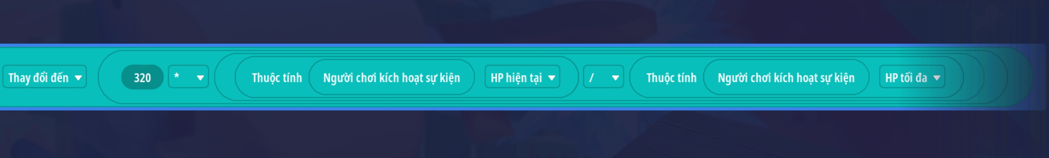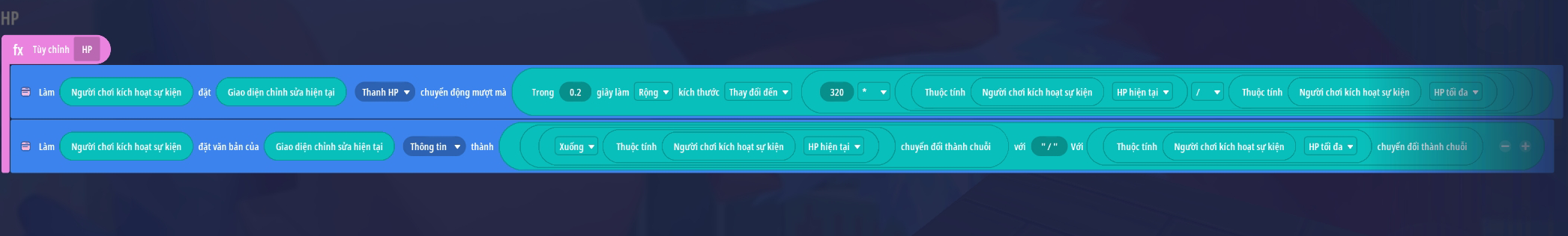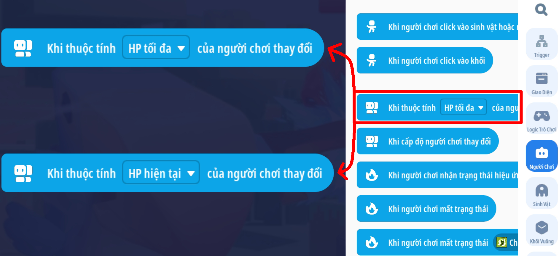 - Bước 4: Thêm sự kiện thuộc tính HP của người chơi thay đổi sẽ kích hoạt mã HP