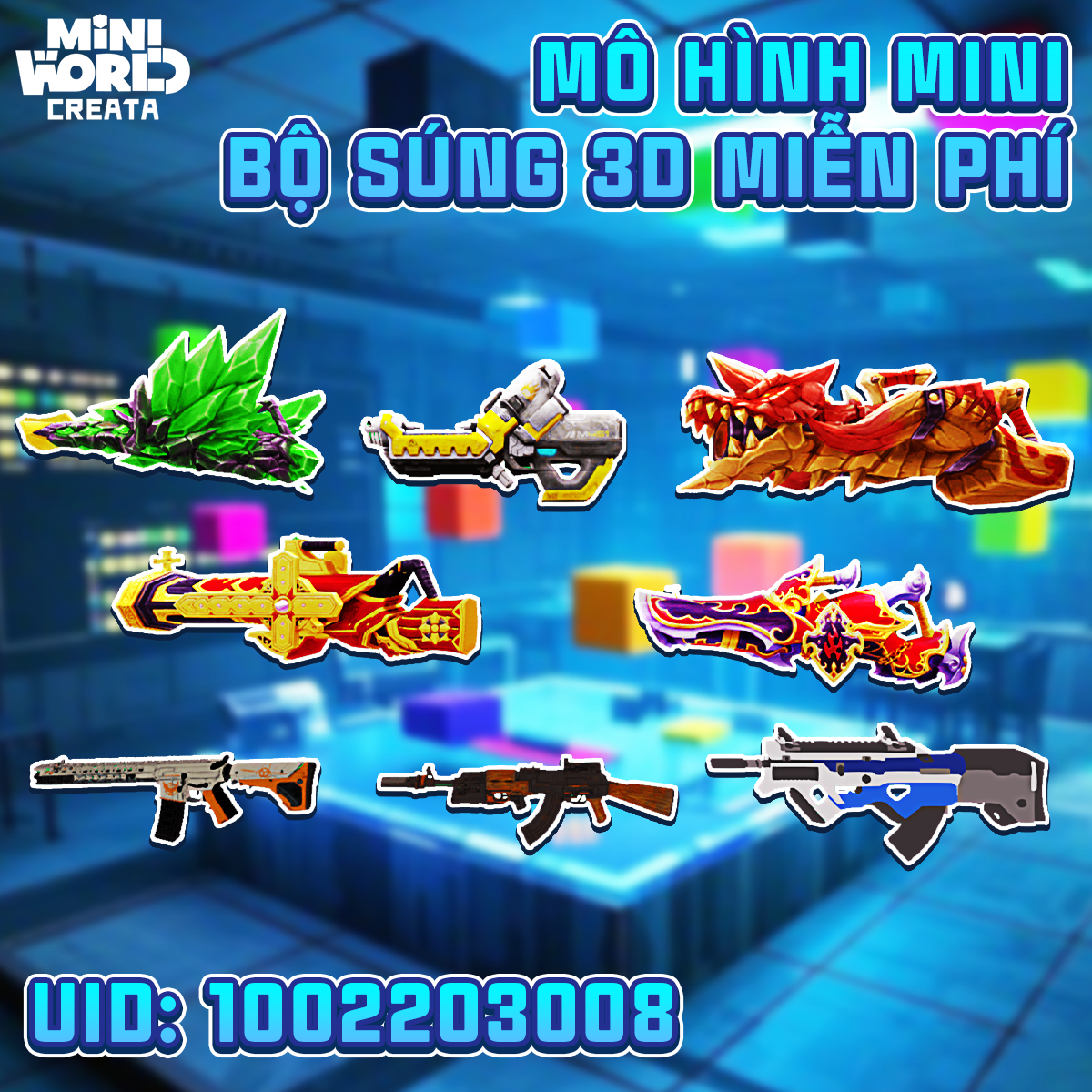 - 📦 Gồm: 8 mẫu súng 3D với phong cách độc lạ (rồng lửa, pha lê, súng hiện đại, súng thần…)
