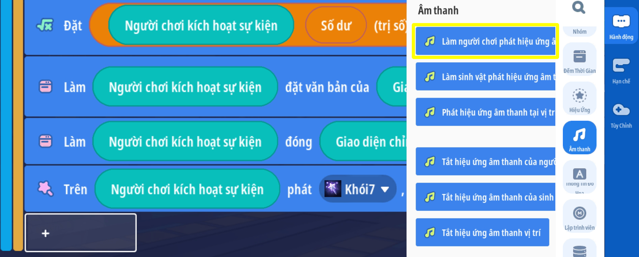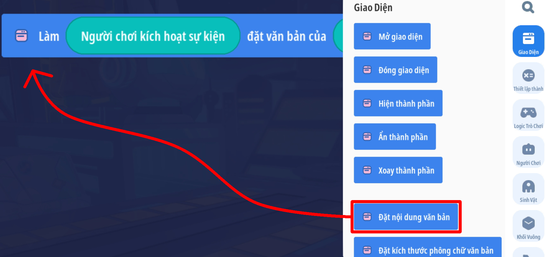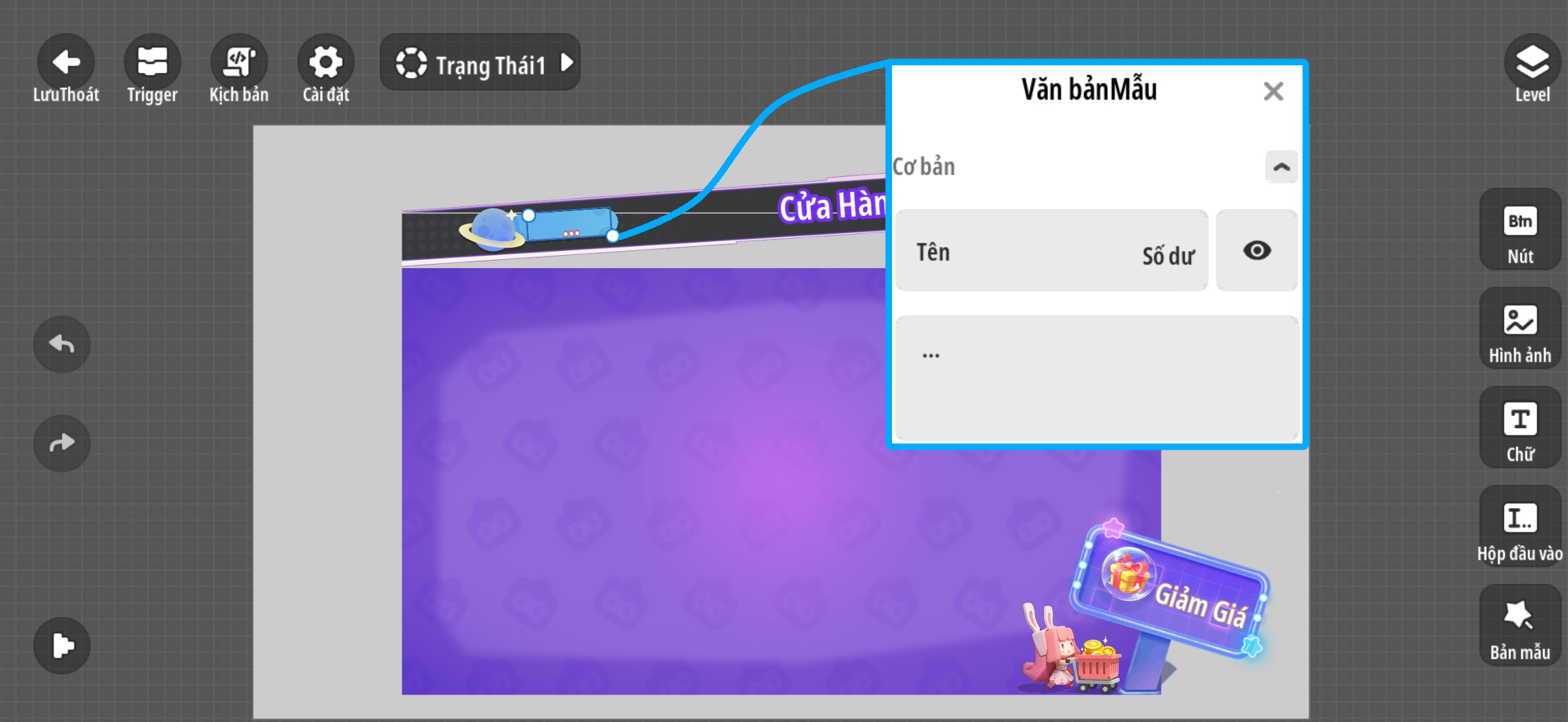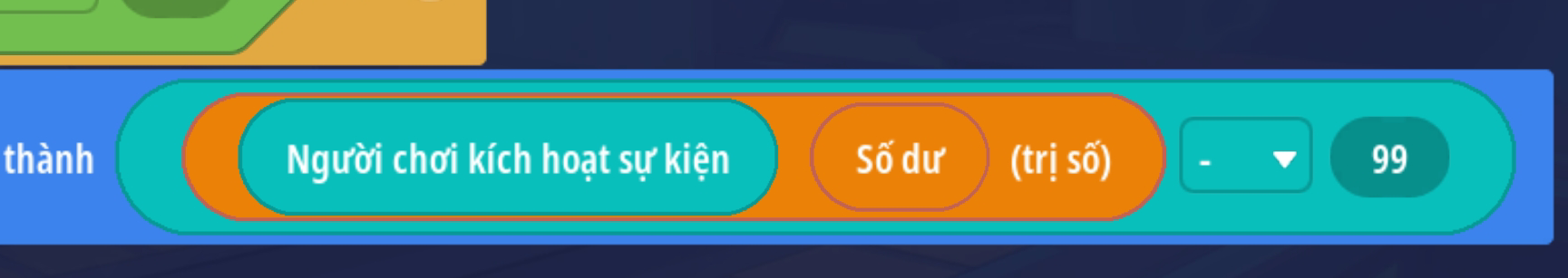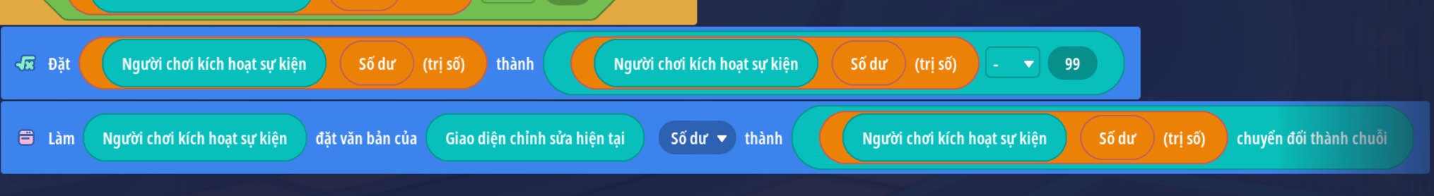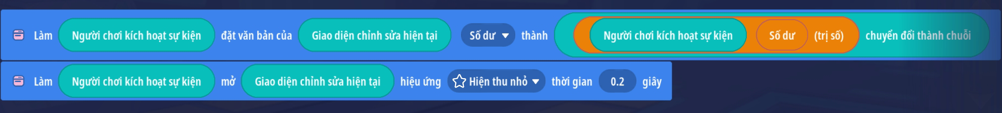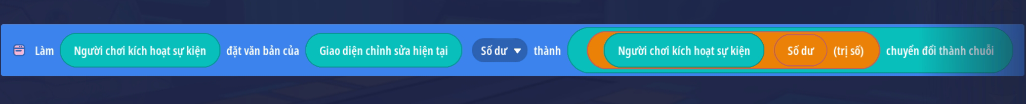 - Tạo sự kiện để mở cửa hàng ( Tùy chức năng mỗi bản đồ). Thêm hành động đặt nội dung văn bản 'Số dư' thành giá trị biến riêng: “Số dư” để cập nhật số tiền hiện tại của người chơi