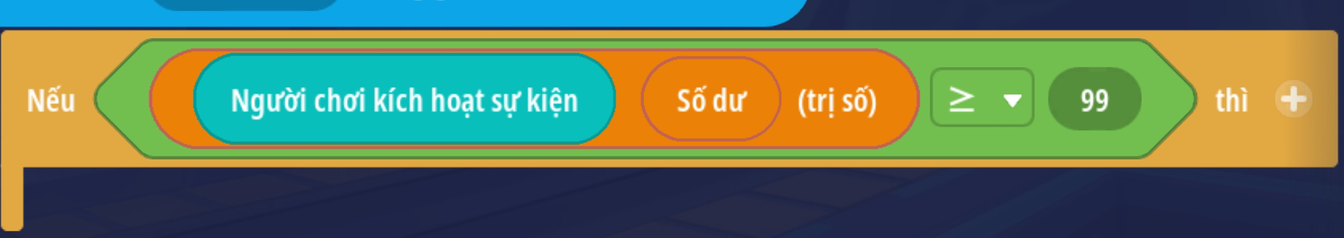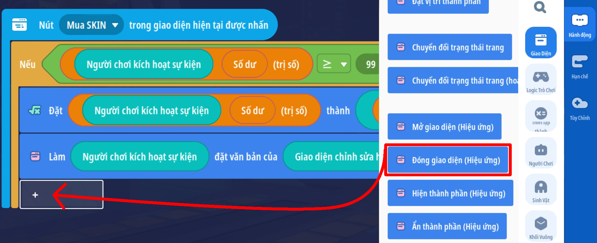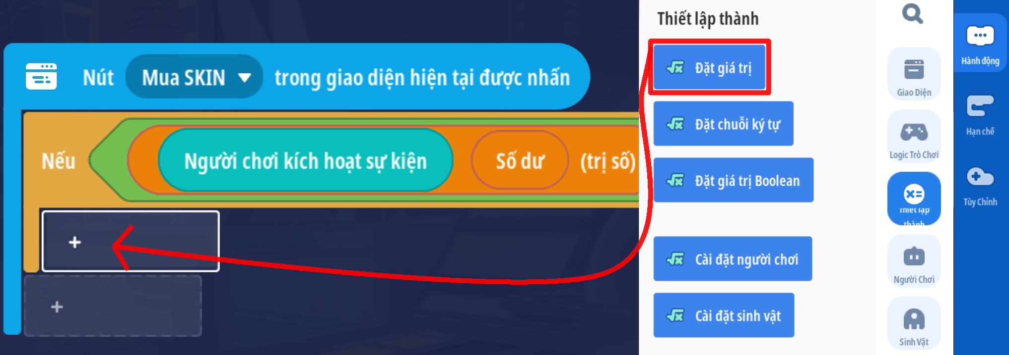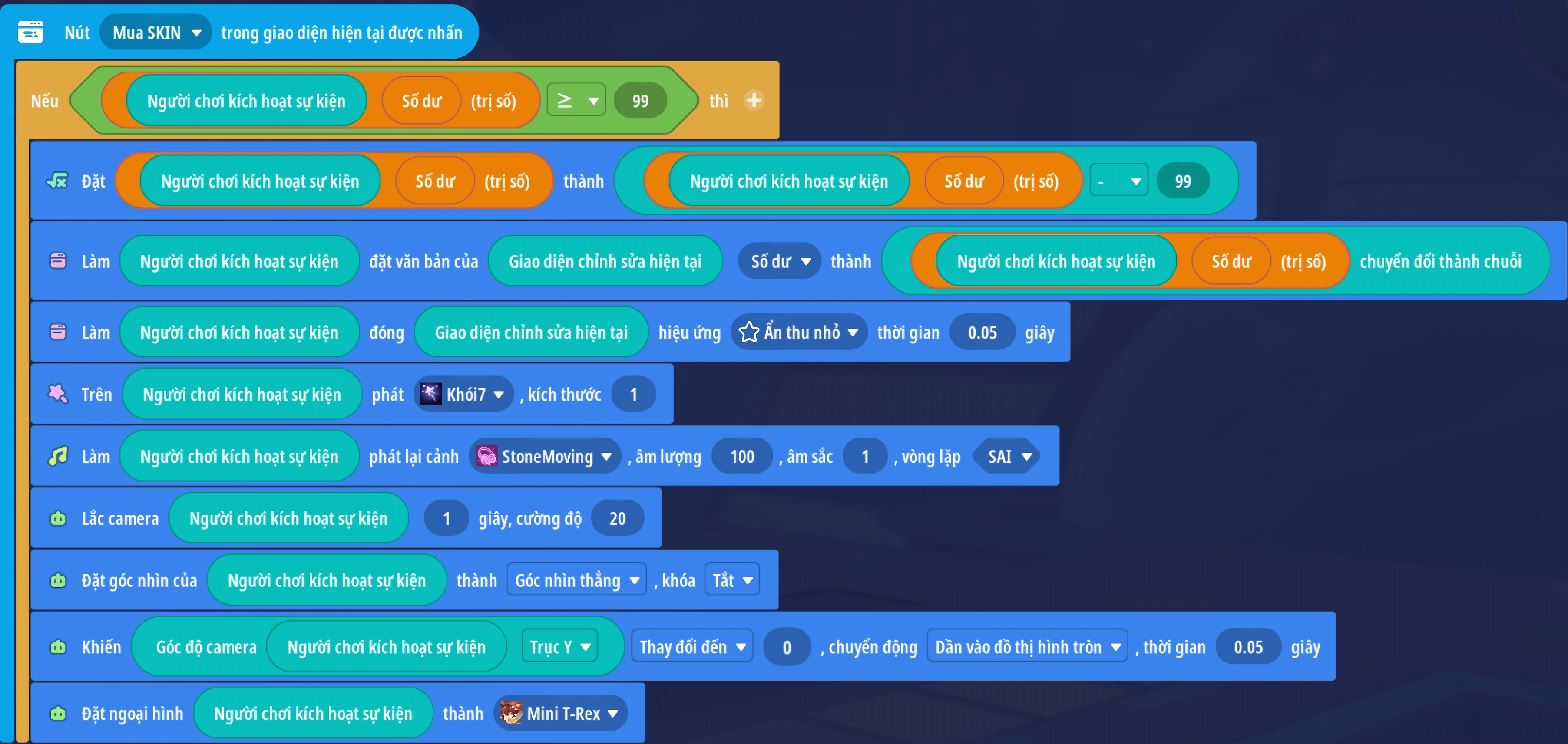 - Tạo sự kiện nút 'Mua SKIN' được nhấn với điều kiện giá trị biến riêng “Số dư” lớn hơn giá mua đã đặt ra