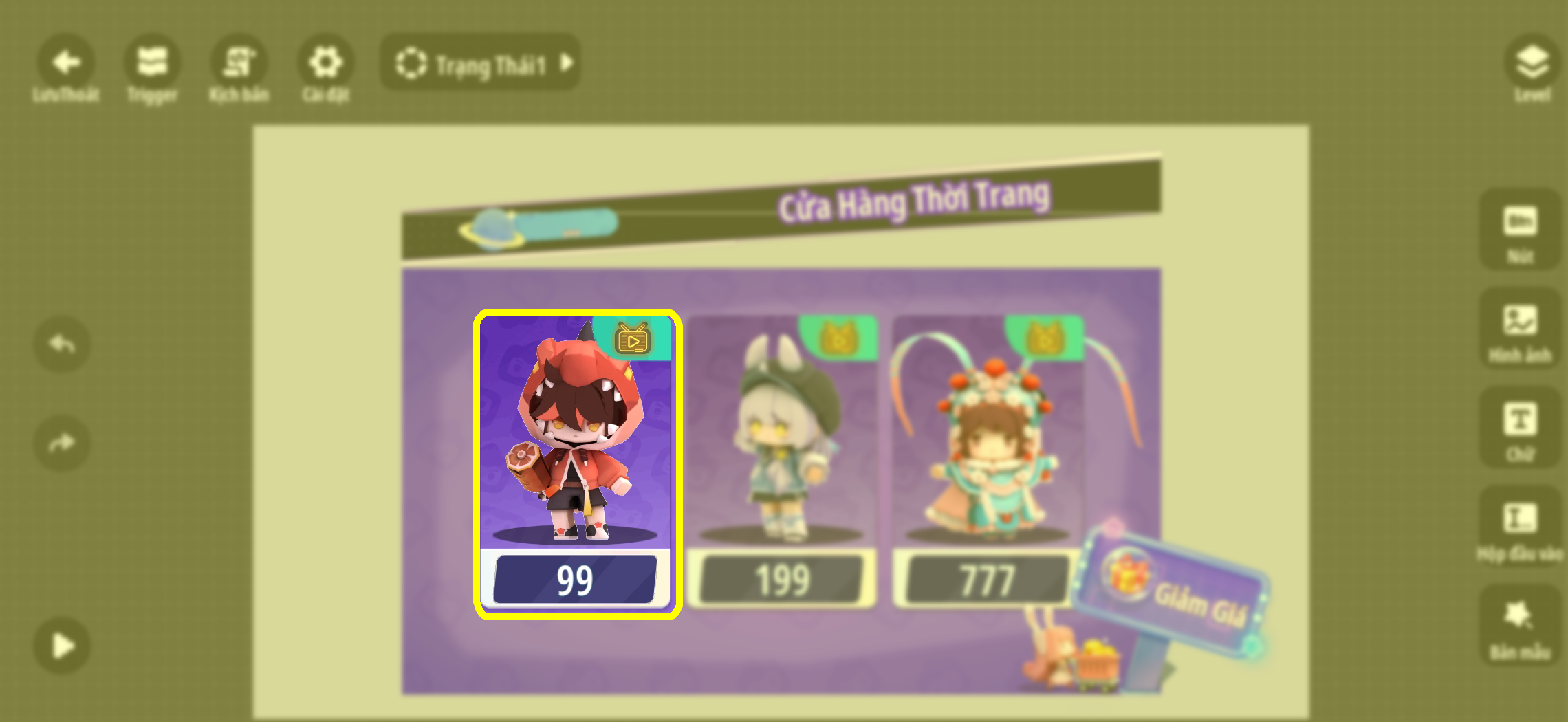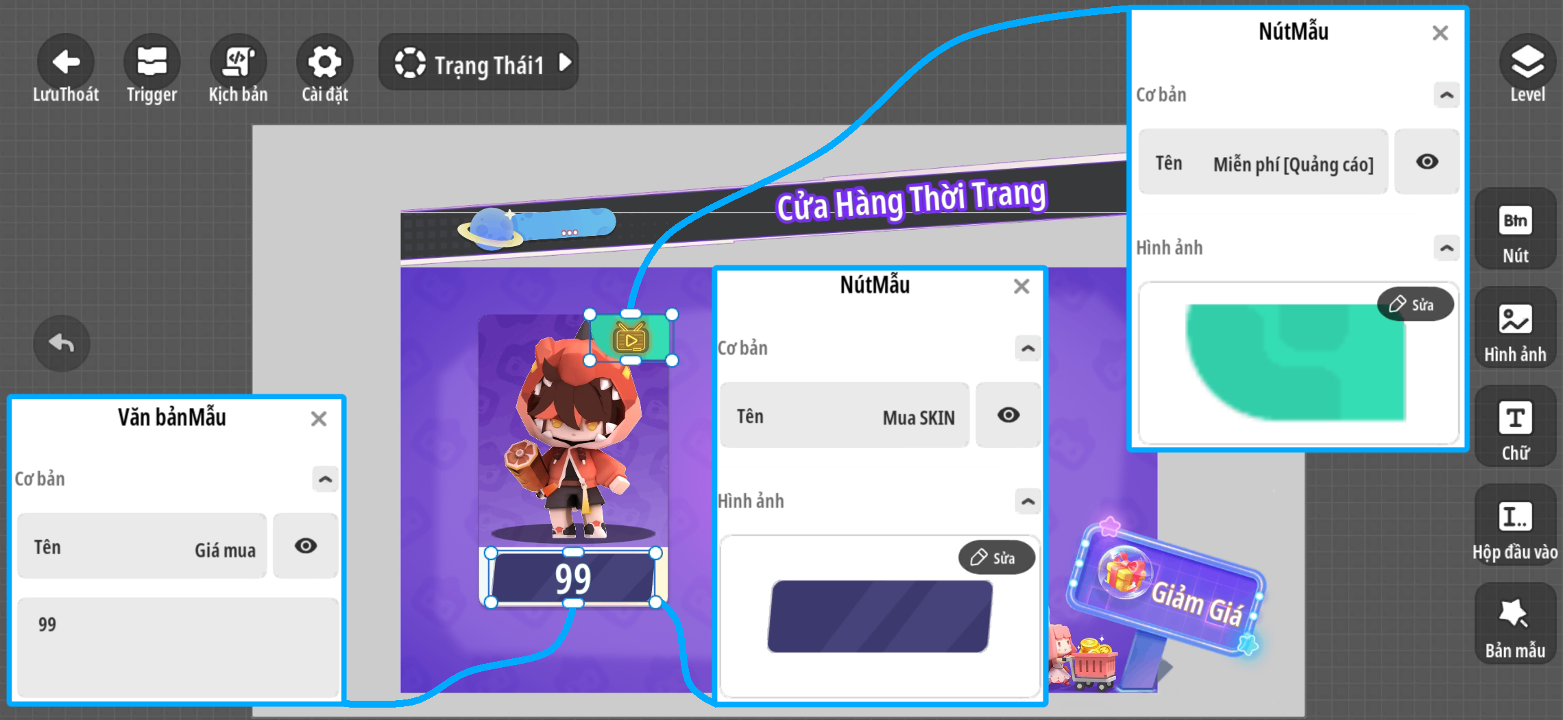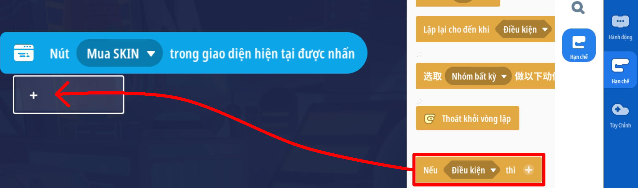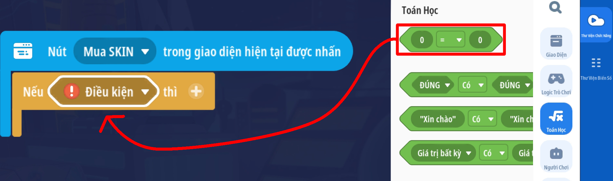 - Tạo sự kiện nút 'Mua SKIN' được nhấn với điều kiện giá trị biến riêng “Số dư” lớn hơn giá mua đã đặt ra