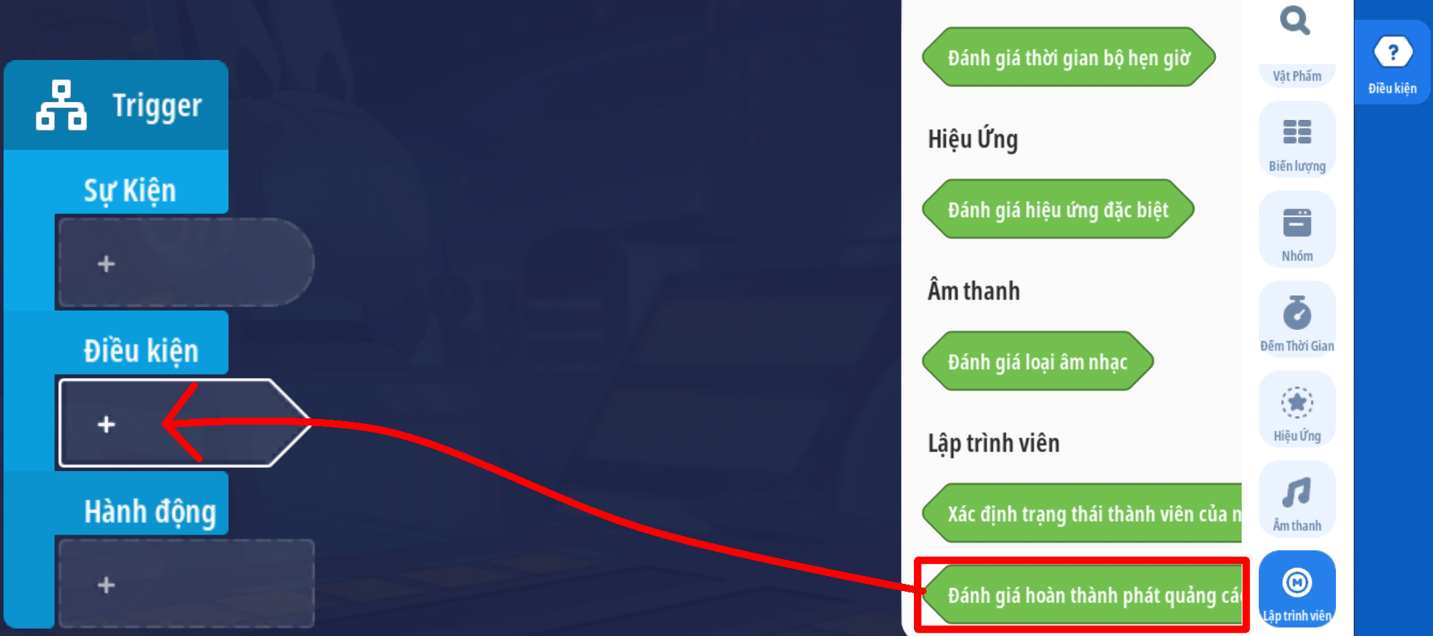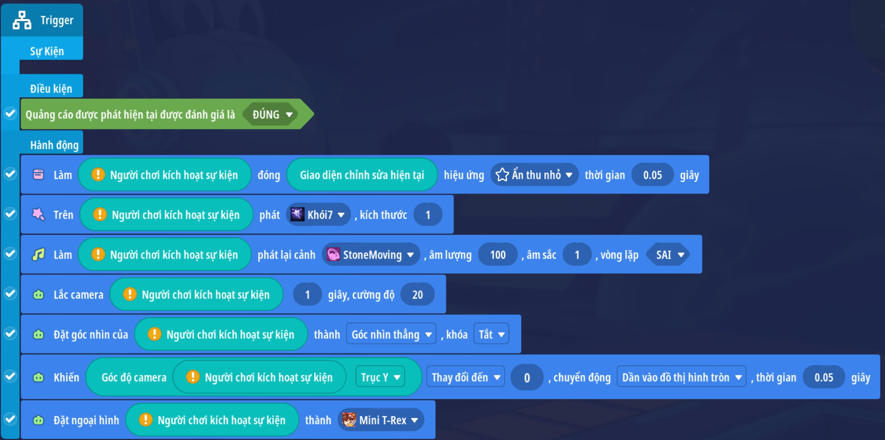 - Tạo trigger với điều kiện xác định người chơi đã xem quảng cáo chưa