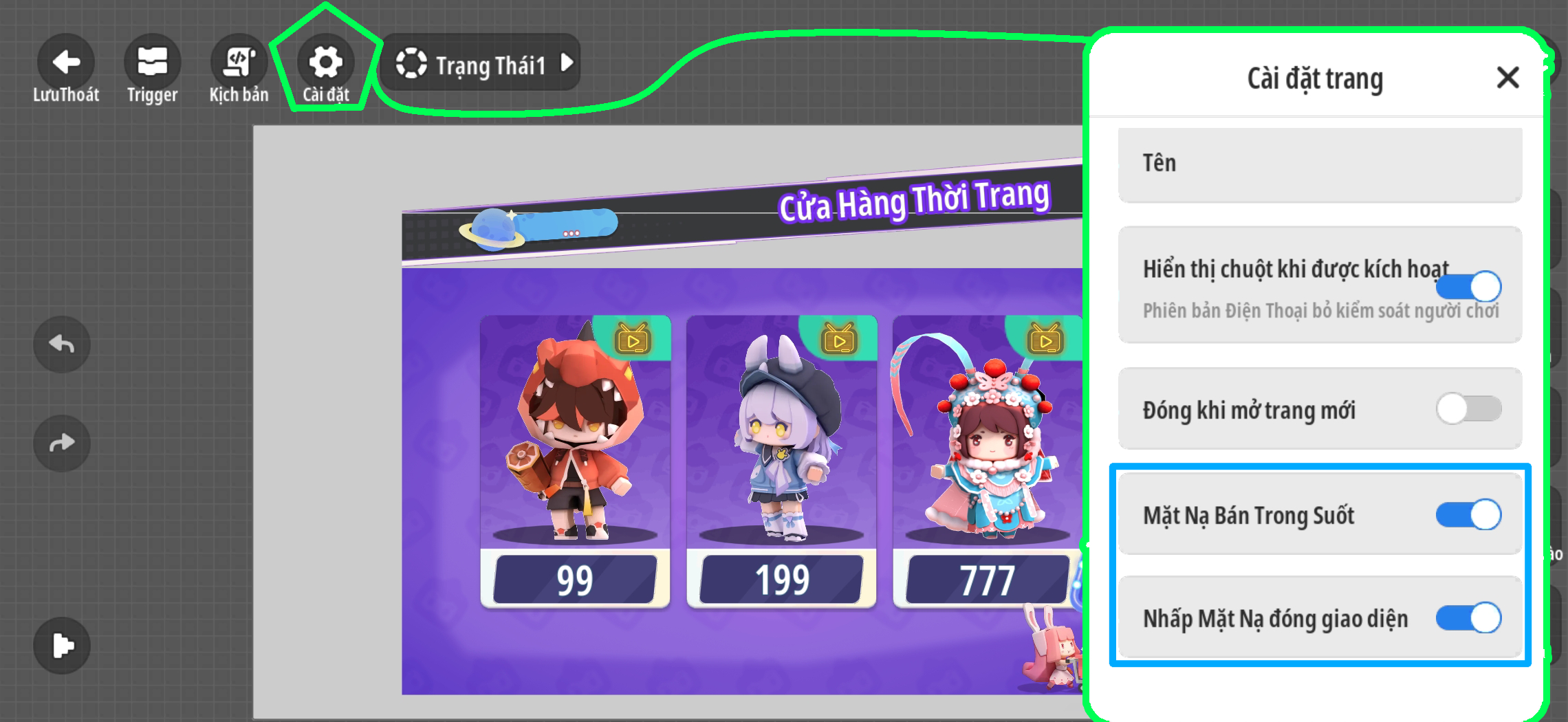 - Thiết lập cài đặt mặt nạ đóng giao diện ( có thể dùng nút thoát để thay thế — tự tìm hiểu )