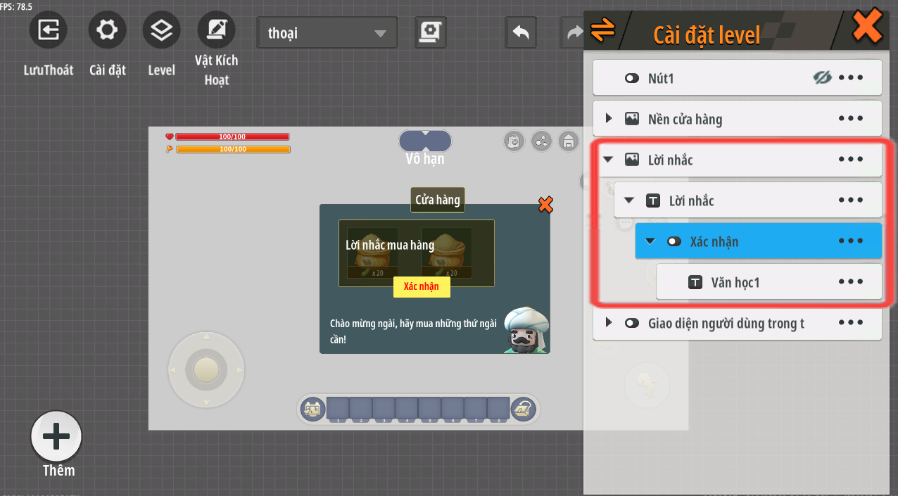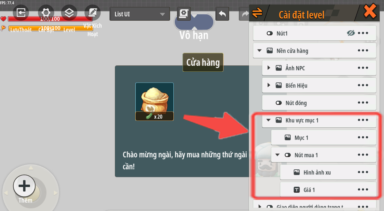 Tạo giao diện UI mới và đặt tên là “store”. Chọn thành phần “nút” để làm lối vào cửa hàng.