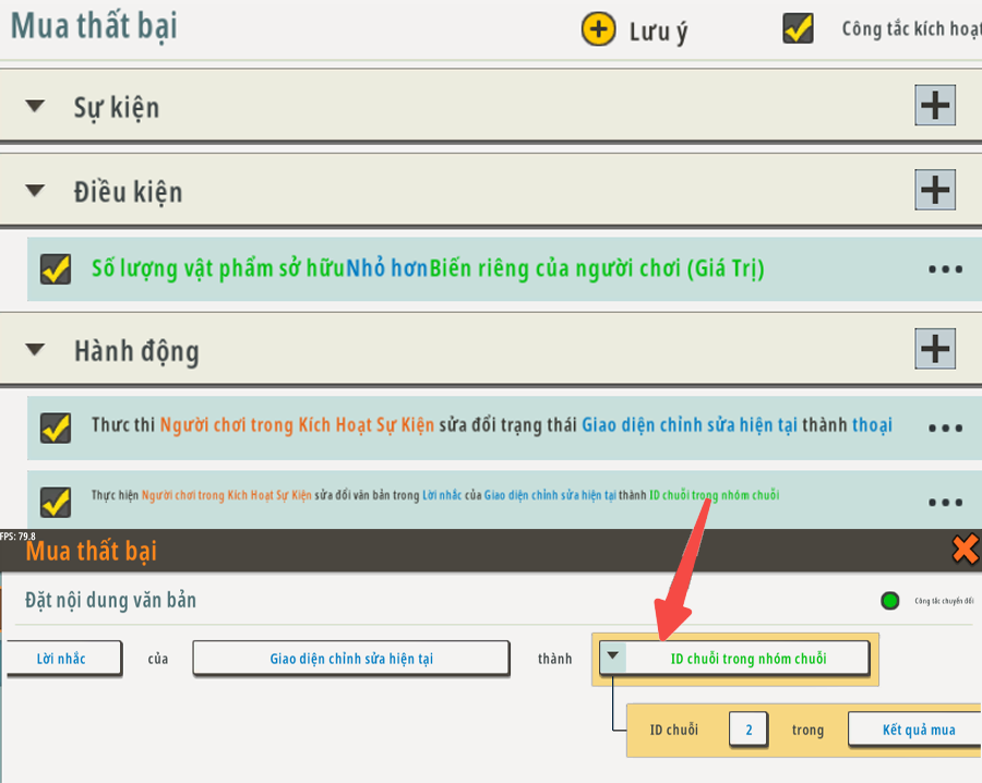 Khi người chơi nhấp vào mua sản phẩm 1, chúng ta cần gán giá trị tương ứng cho biến riêng tư của người chơi “Thanh toán”, “Mặt hàng đã mua”.