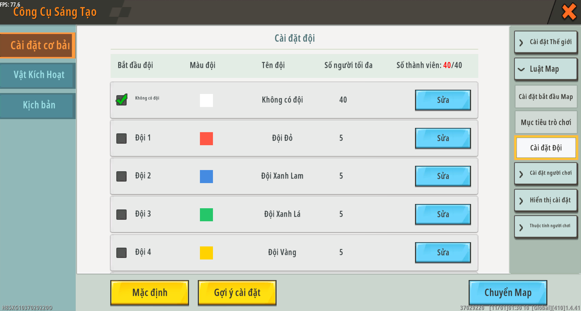 - Đội mở (không có đội /đỏ /xanh dương /xanh lá cây /vàng /cam /tím) Phương thức phân bổ đội (phân bổ tuần tự/phân bổ ngẫu nhiên/không phân bổ/chọn người chơi khi bắt đầu)