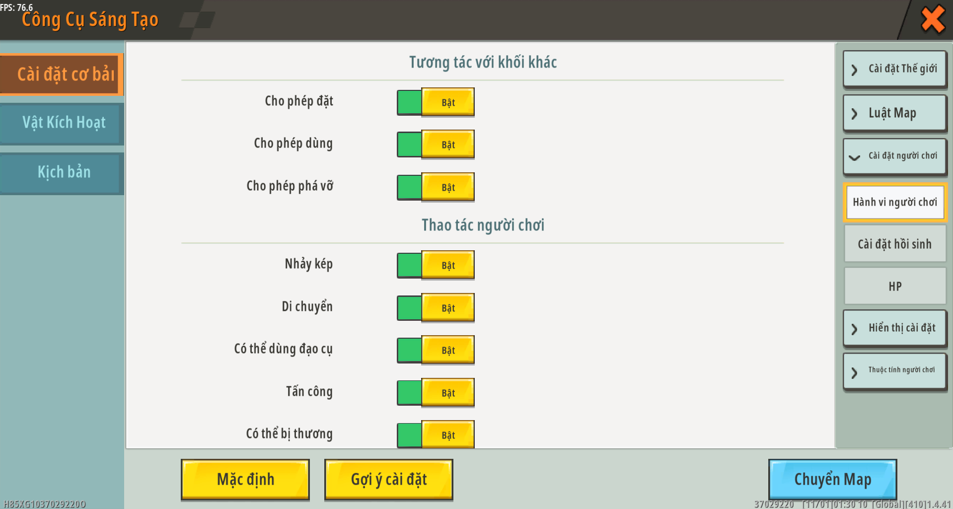 Bạn có thể đặt hành vi và quyền của người chơi trong cài đặt người chơi, bao gồm hành vi của người chơi, cài đặt hồi sinh và mạng sống.