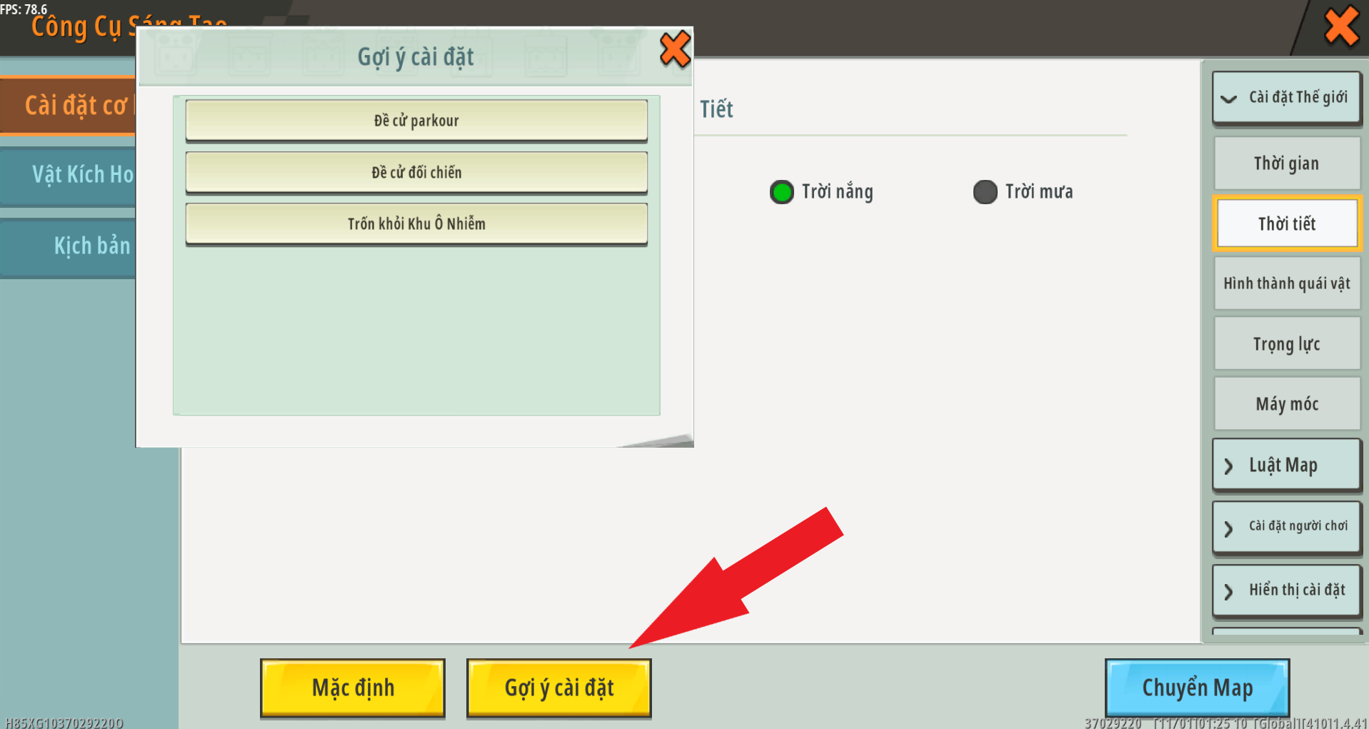 Trước khi bắt đầu các cài đặt khác nhau, bạn cũng có thể sử dụng các cài đặt được đề xuất bên dưới để xem một số tùy chọn đặt trước, bao gồm ba cài đặt trước cho parkour, chiến đấu và thoát khỏi ô nhiễm. Nếu bạn chọn sử dụng cài đặt được đề xuất, bạn cũng nên kiểm tra cài đặt tương ứng sau khi lựa chọn và chọn theo tình hình thực tế trên bản đồ của bạn.