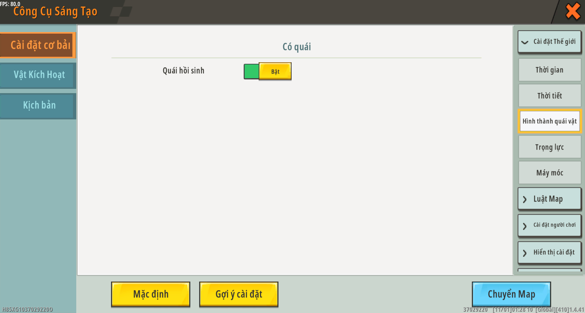 Có tạo quái vật hay không (bật/tắt): Chọn xem bản đồ hiện tại có tự động tạo quái vật hay không.