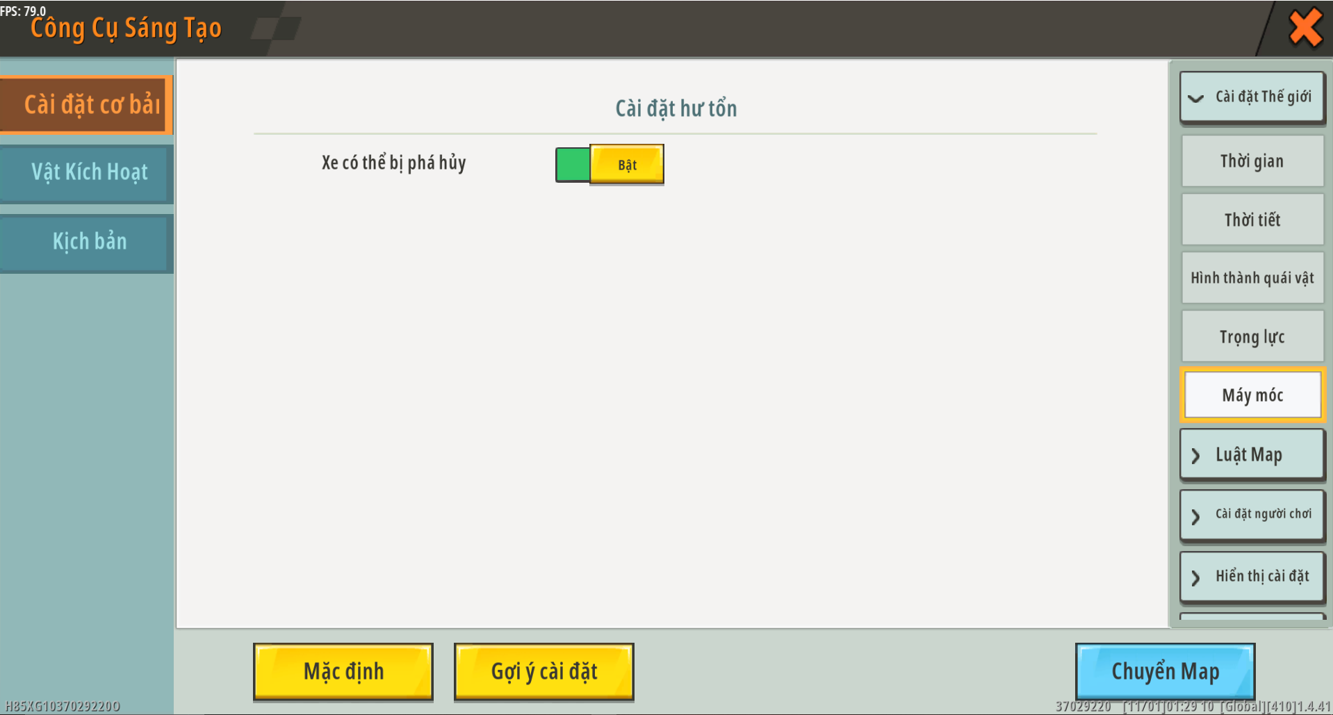 Phương tiện cơ giới có thể phá hủy (Bật/Tắt): Phương tiện cơ giới có thể phá hủy được bật theo mặc định. Nếu bạn sử dụng phương tiện cơ khí trong game để tạo bản đồ game đua xe thì cần phải tắt tùy chọn này.