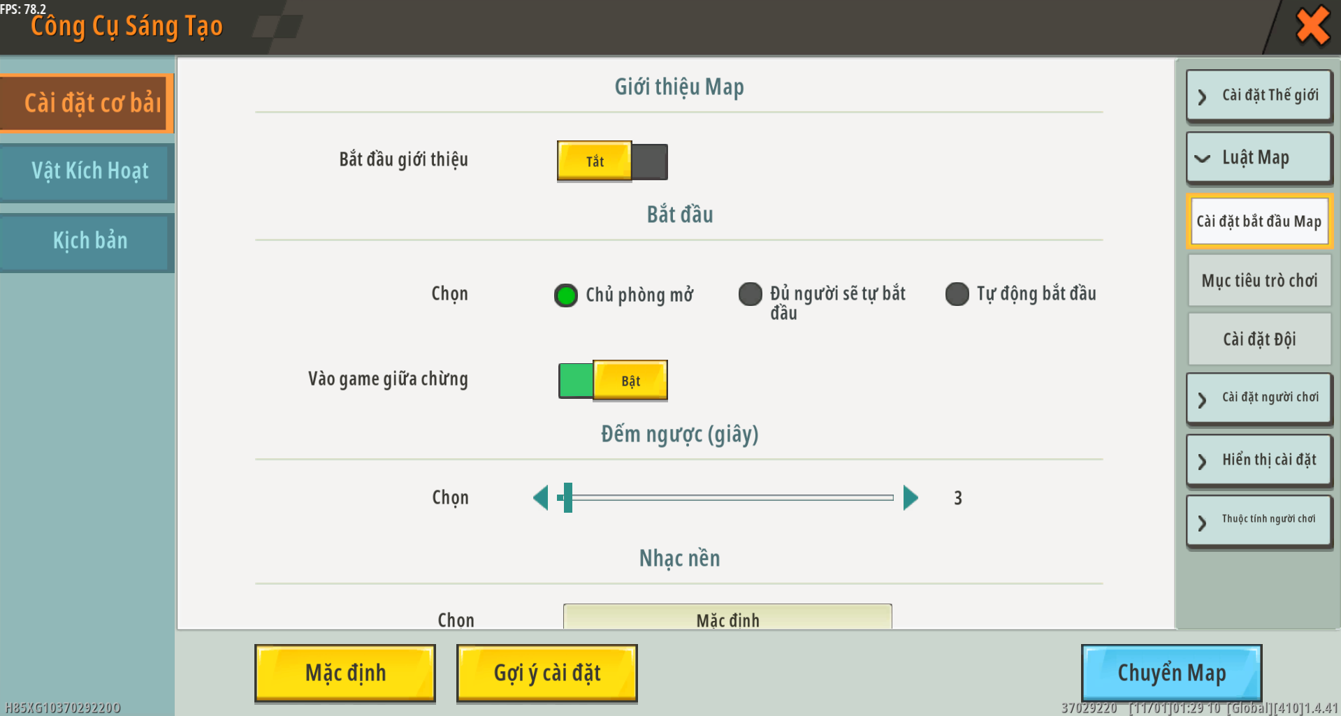 - Nhạc nền (thế giới tăng tốc, linh hồn lạ, phong cách Trung Hoa, trận chiến, thần cô đơn, không khí giải mã, bom, sân bóng, không có nhạc): Chọn nhạc tương ứng theo chủ đề bản đồ của riêng bạn.