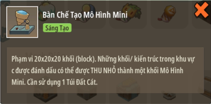Bàn Chế Tạo Mô Hình Mini có thể được đặt trên mặt đất để tạo thành một khu vực 3D. Bạn có thể tự do xây dựng bên trong, sau khi hoàn thành > bấm vào Bàn chế tạo mô hình để thu nhỏ mọi thứ trong khu vực đó thành một khối duy nhất. Do đó, nó còn được gọi là “mô hình thu nhỏ”