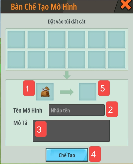 ①Đặt Túi Đất Cát vào Bàn Chế Tạo Mô Hình (Túi Đất Cát sẽ tự động được đưa vào Bàn Chế Tạo Mô Hình)