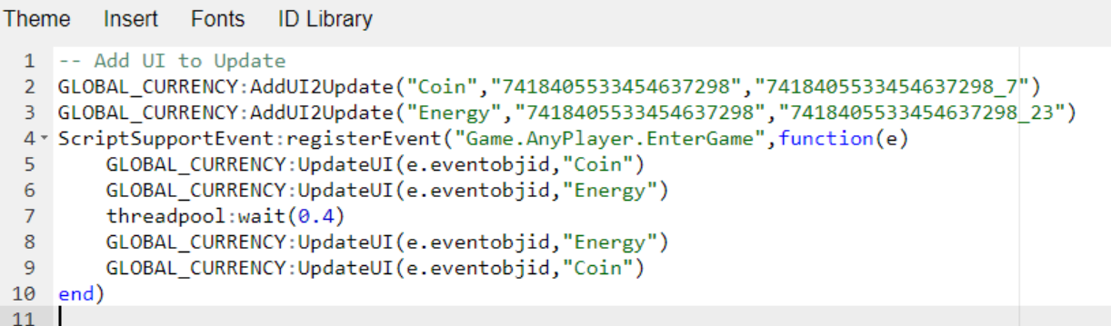 -- Store UI_Data inside GLOBAL_CURRENCY GLOBAL_CURRENCY.UI_DATA={} -- This is Tell What UI element should be updated when calling UpdateUI for player function GLOBAL_CURRENCY:AddUI2Update(name,uiid,elementid) if GLOBAL_CURRENCY.UI_DATA[name] == nil then -- initiate an Empty table if it is nil GLOBAL_CURRENCY.UI_DATA[name] = {} end table.insert(GLOBAL_CURRENCY.UI_DATA[name],{uiid=uiid,elementid=elementid}); end -- Can Be Called from any UI element to update the UI function GLOBAL_CURRENCY:UpdateUI(playerid,name) if GLOBAL_CURRENCY.UI_DATA[name] == nil then print("FAILED TO UPDATE UI : NO ELEMENTID WERE ADDED") return false end local ammountPretty = GLOBAL_CURRENCY:PrettyDisplay(GLOBAL_CURRENCY:GetCurrency(playerid,name)) for i,a in ipairs(GLOBAL_CURRENCY.UI_DATA[name]) do Customui:setText(playerid,a.uiid,a.elementid,ammountPretty) end end
